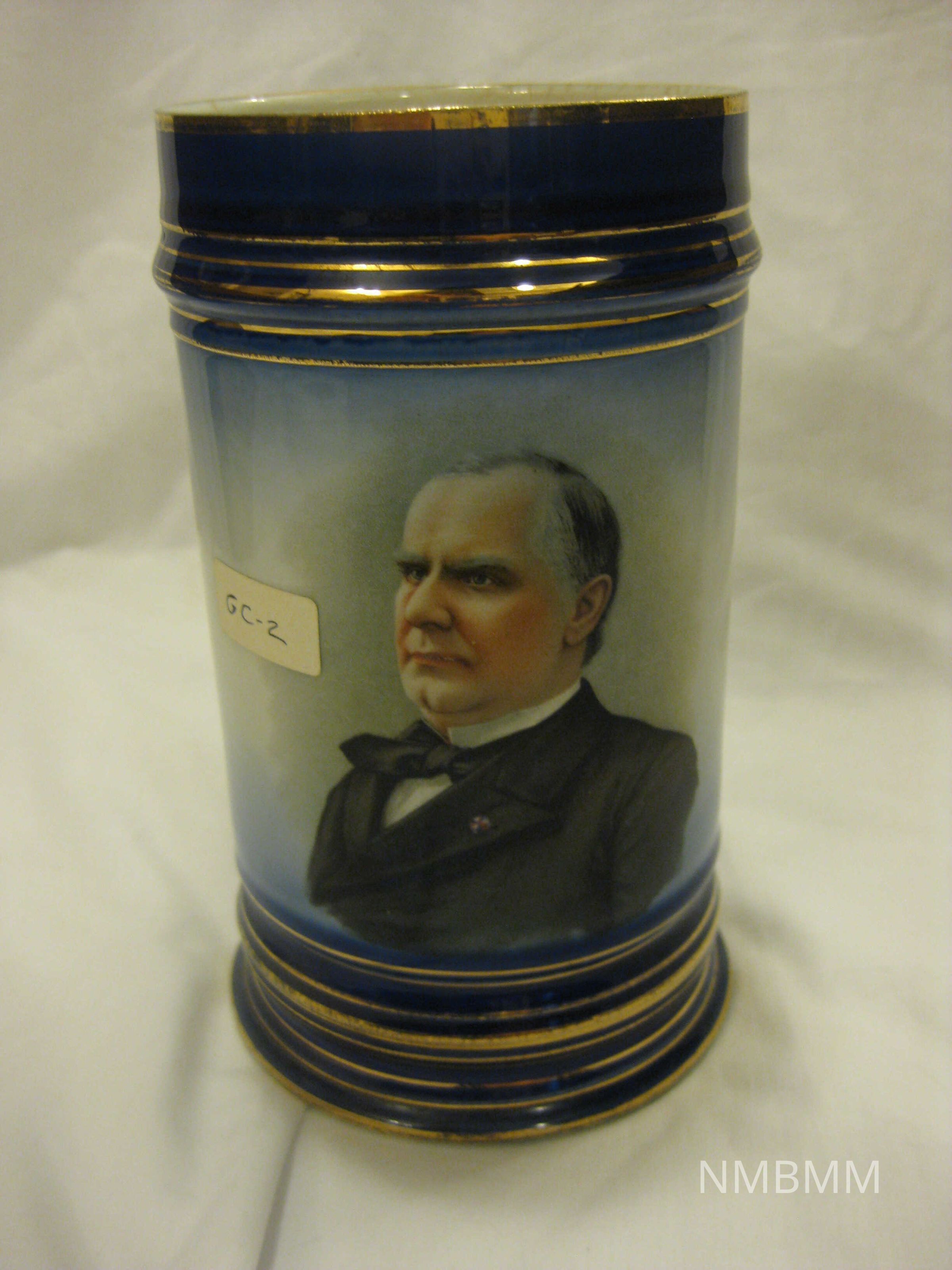 This item is a large decorative blue mug with a picture of McKinley on the side. The top and bottom are embellished with gold stripes. The bottom of the inside of the mug is badly cracked.4.75" by 7"Collection
