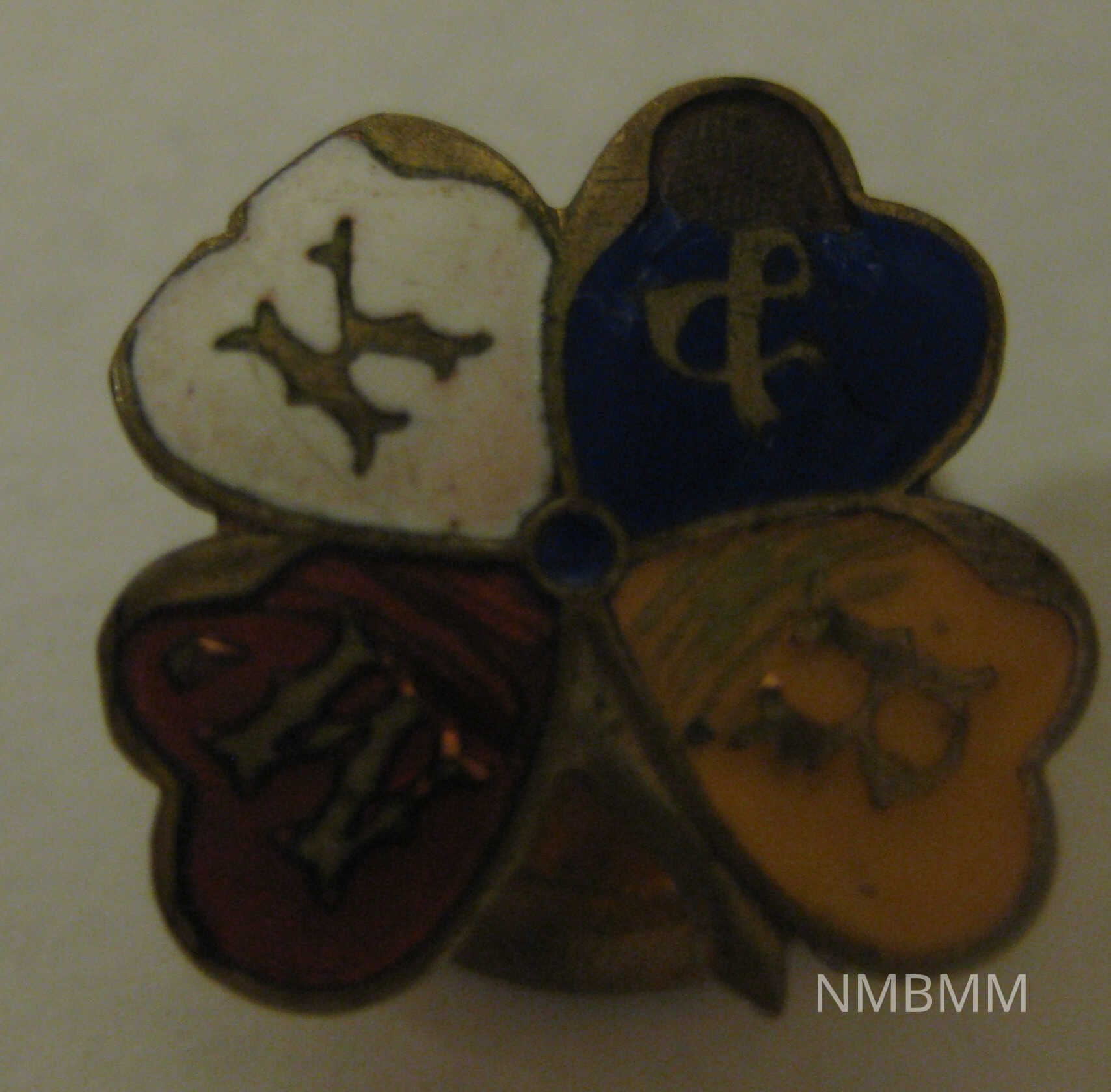 This item is a small campaign pin that is in the shape of a four leaf clover with the colors of red, white, blue and yellow. Each leaf has a letter, "M, K, and R." 1/2" in diameter