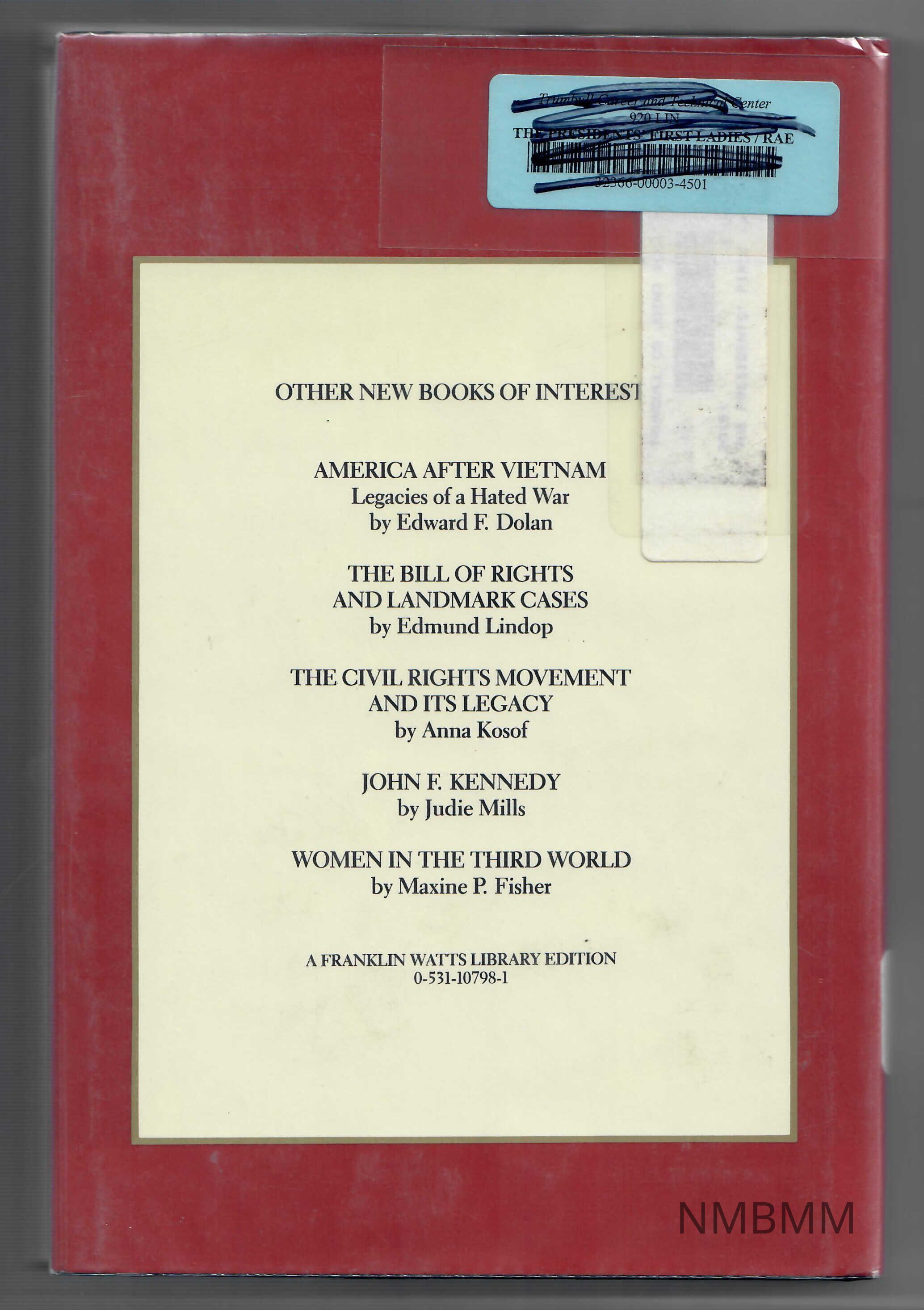 Hardbound. The dust jacket features the images of Martha Washington, Jackie Kennedy, Eleanor Roosevelt, and Nancy Reagan surrounded by a gold border, on a red background. The title is in gold letters at the top, and the author's name is in black letters at the bottom. The back features a list of "Other Books of Interest" on a white background, surrounded by a gold border. In turn, this is on a red background. The are stickers at the top right corner: a blue one with a bar code crossed out, and a white, illegible one.Collection