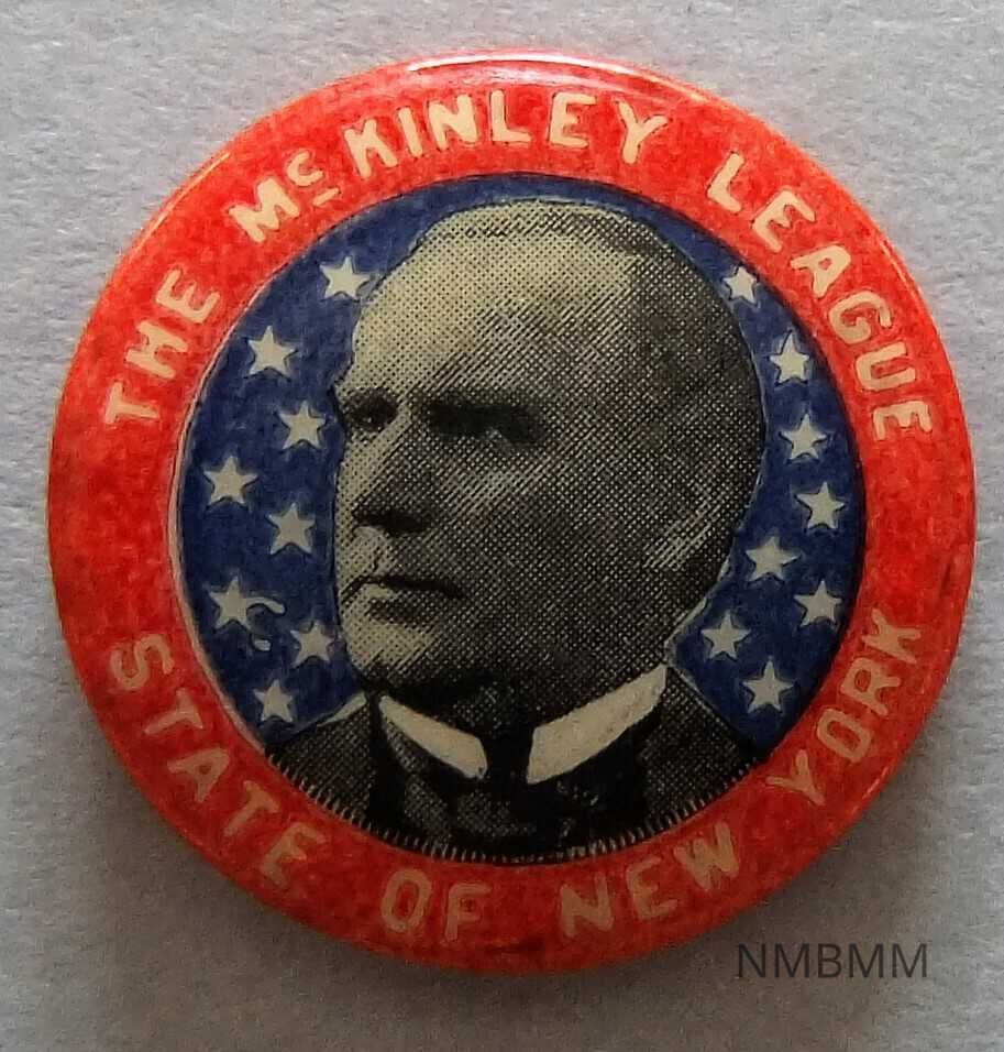 This item is a small campaign pin that has a red border and a blue background with white stars. In the middle is an image of McKinley and white lettering around the border reads "The McKinley League, State of New York." Slightly dented in the middle, .75" in diameter.Collection
