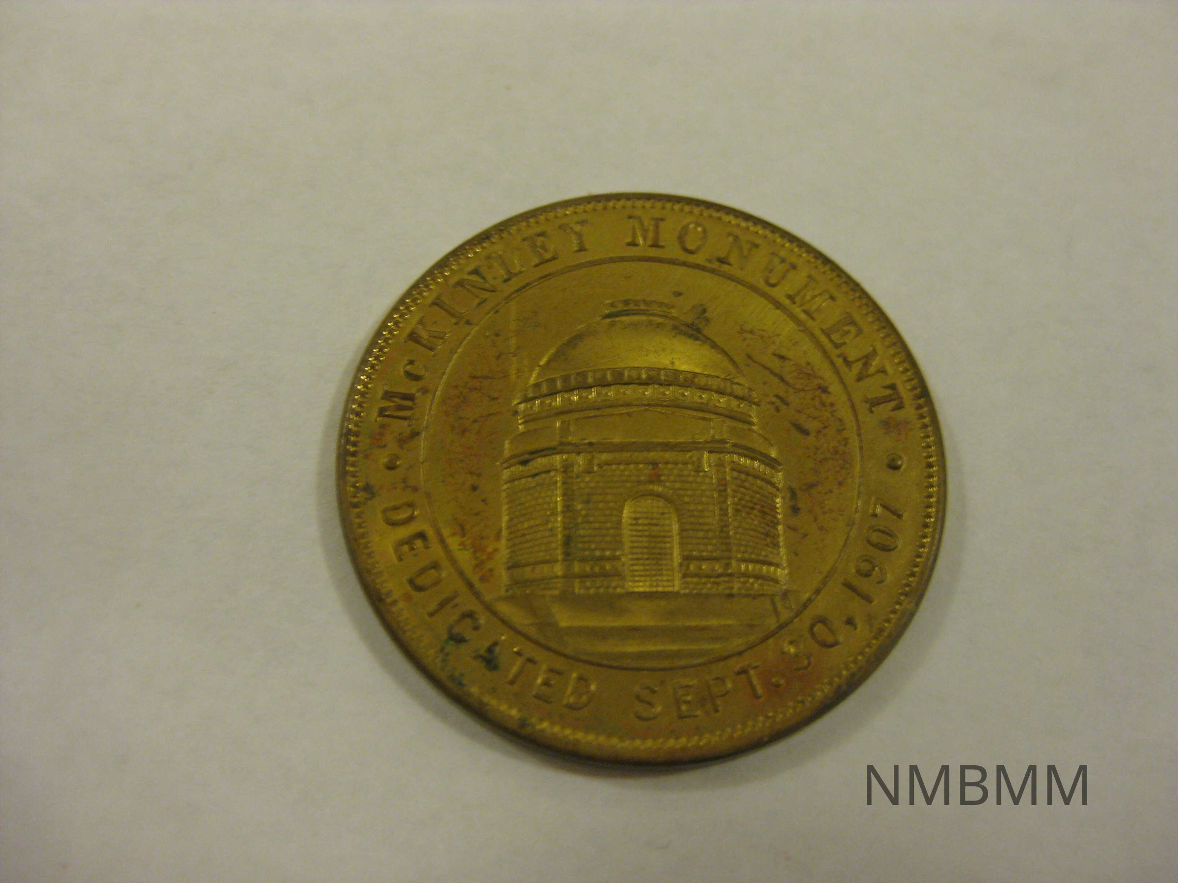 This item is a small gold souvenir coin has an image of the McKinley monument on one side with the text "McKinley Monument, dedicated Sept. 30, 1907." The backside reads "Byron S.Loutzenhiser, Republican Candidate for County Coroner, subject to the decision of the Republican Primaries, May 17, 1910."Collection