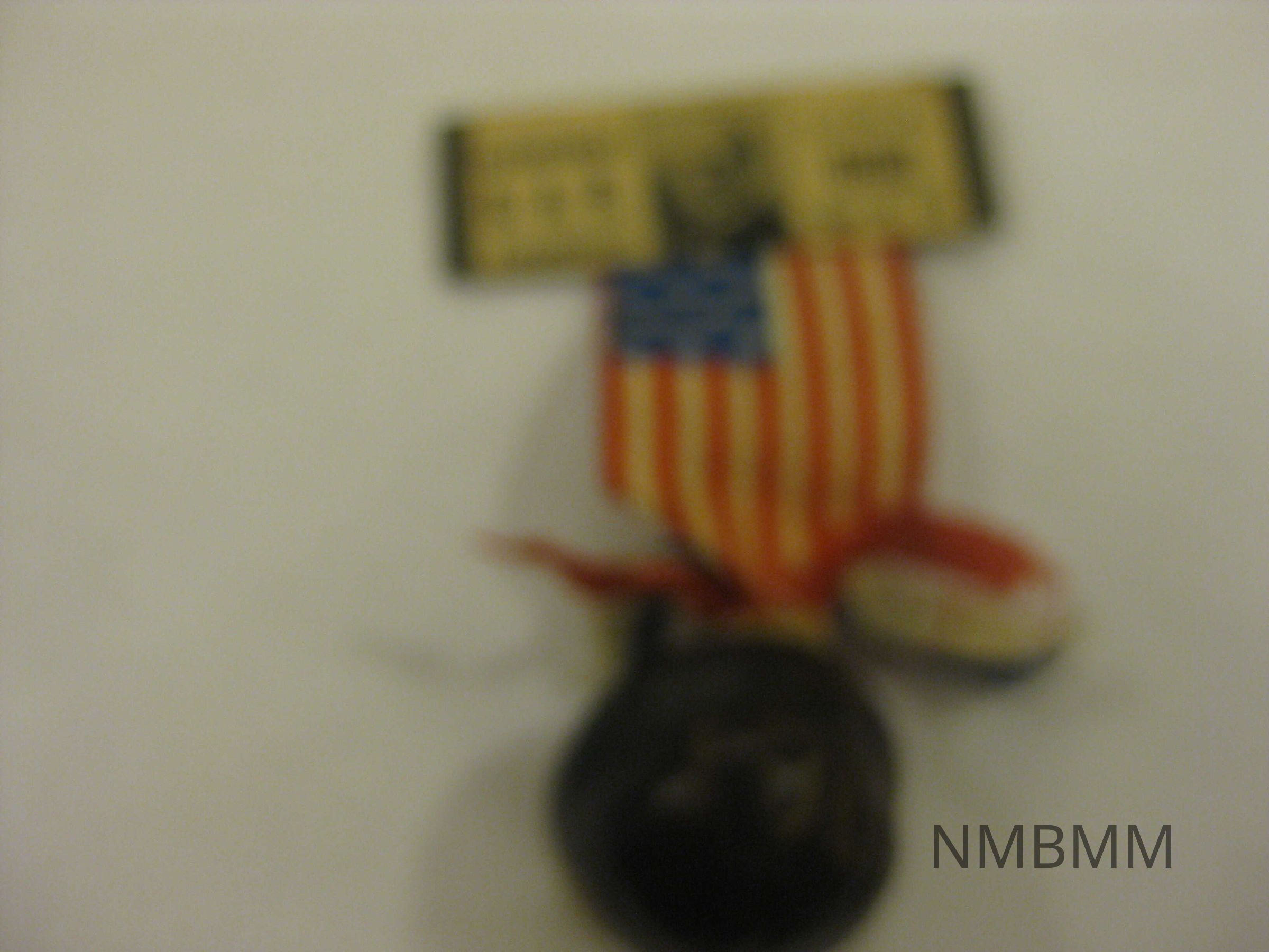 This item is a small souvenir of a badge that reads "Department G.A.R. Encampment. Lima, Ohio, June 15-19." Beneath the badge is an American flag ribbon that is attatched to a buckeye. 2.25" by 3.5"