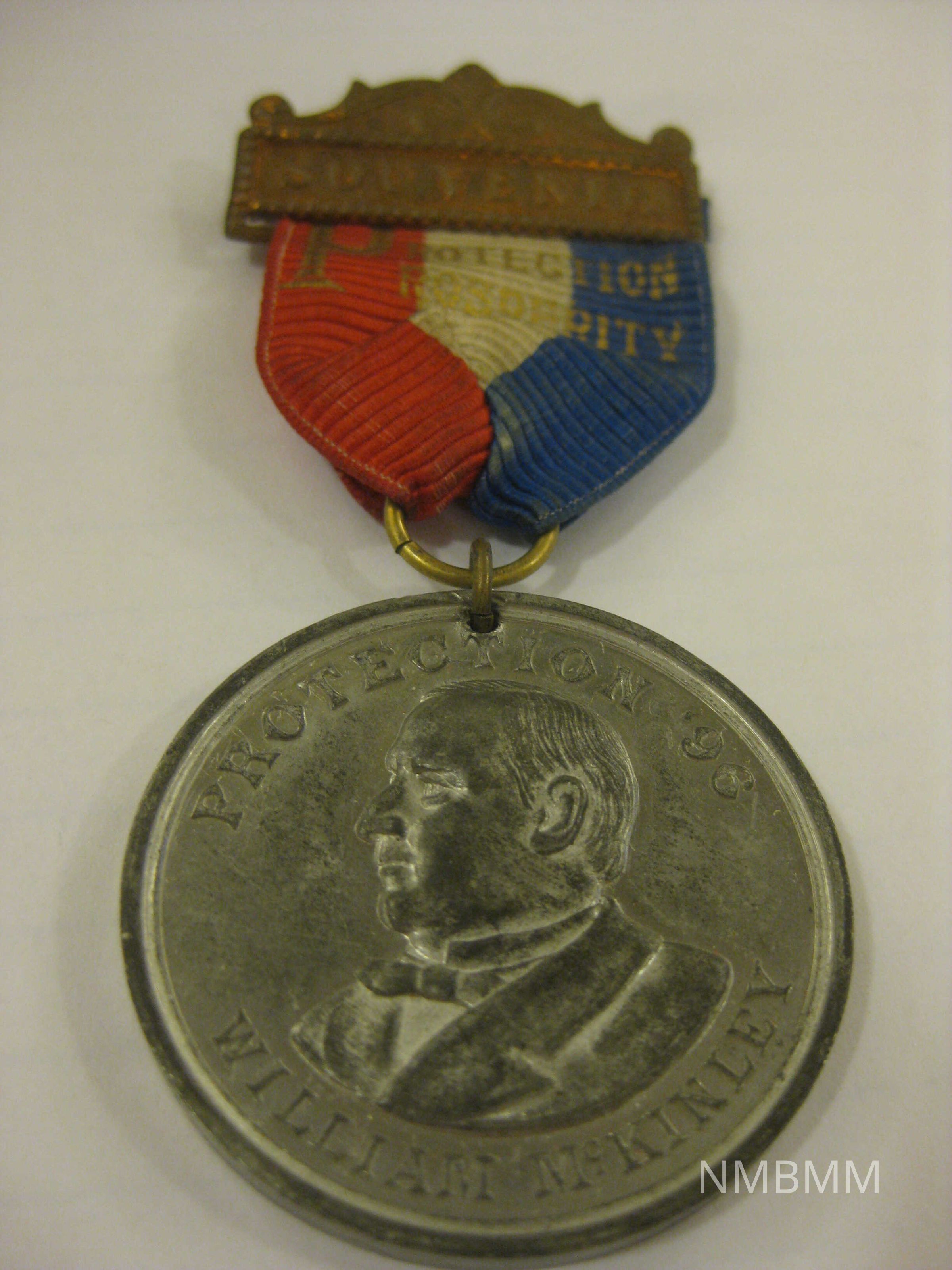 The item is a souvenir pin. The bronze piece reading "Souvenir" is attatched to a red, white and blue ribbon with gold lettering that reads "Patriotism, Protection, Prosperity". On the bottom is a silver medal with McKinley's likeness engraved and the words "Protection '96, William McKinley." On the back is an image of a landscape with the lettering "St. Louis Convention, June 16, 1896."Collection