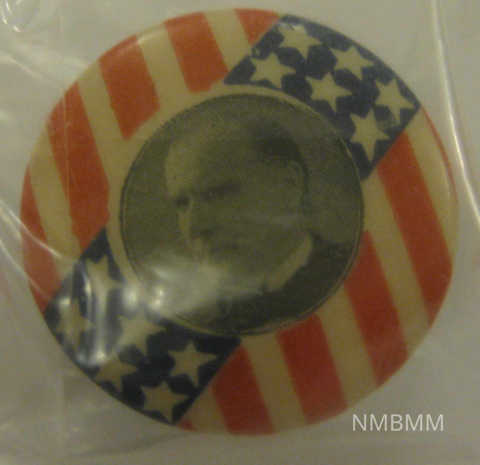 The item is a button with a red white and blue background and a black and white image of McKinley in the middle. It was made by the Baldwin and Gleason Co and has a button back. 3/4" diameter, some tarnishing.Collection