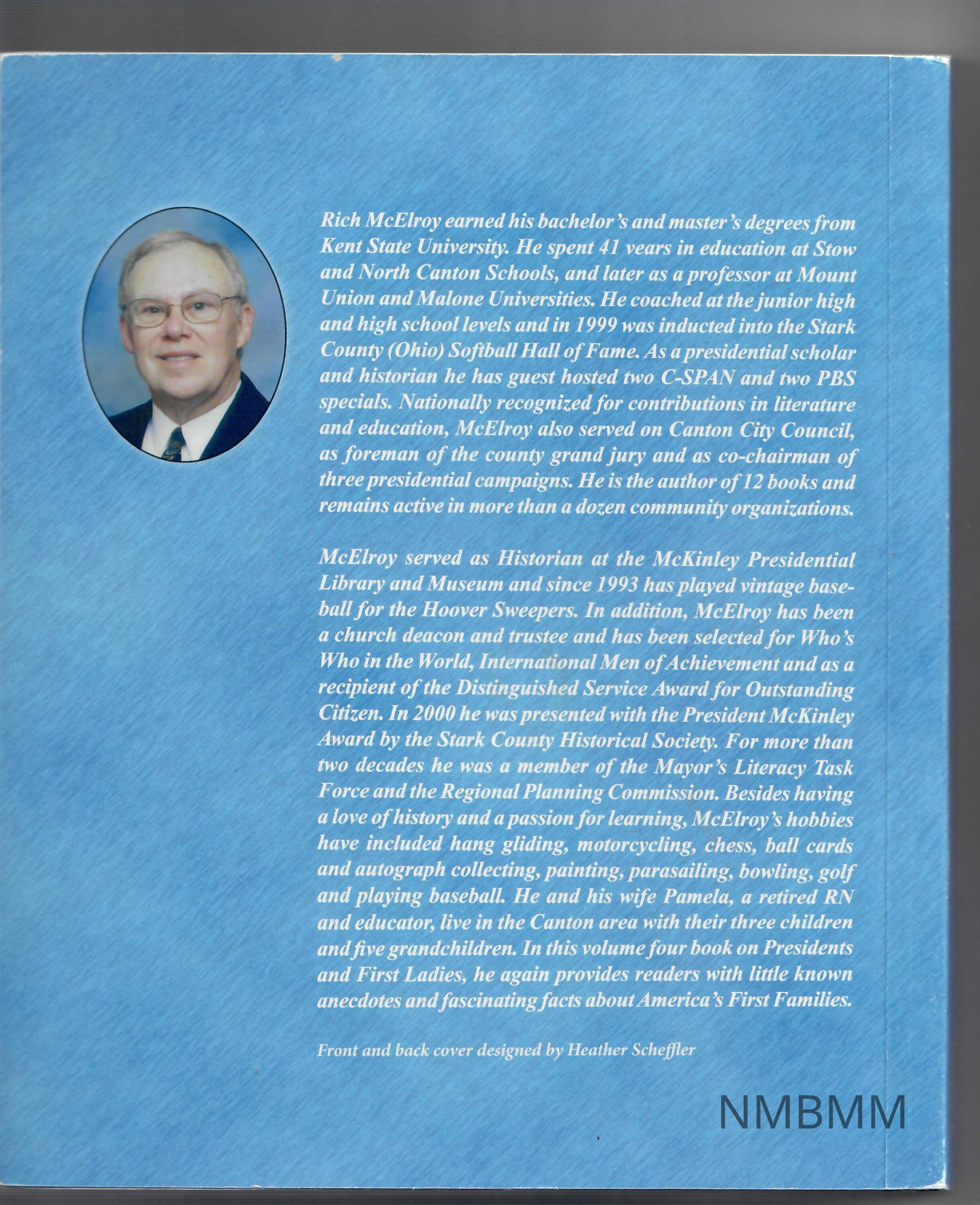 A look at all forty five presidents of the United States and their First Ladies, this paper back book includes anecdotes about all. This copy is autographed to "To Pat thanks for helping preserve the memory of a great pair of Americans! god Bless You and Yours; Vaya con dios Good reading & all My Best. Enjoy my book. Richard L.McElroy, Psalm 139 3-15-2018" on the inside leaf. "Pat" is Trish Scarmuzzi, Curator of the National McKinley Birthplace Memorial Museum.