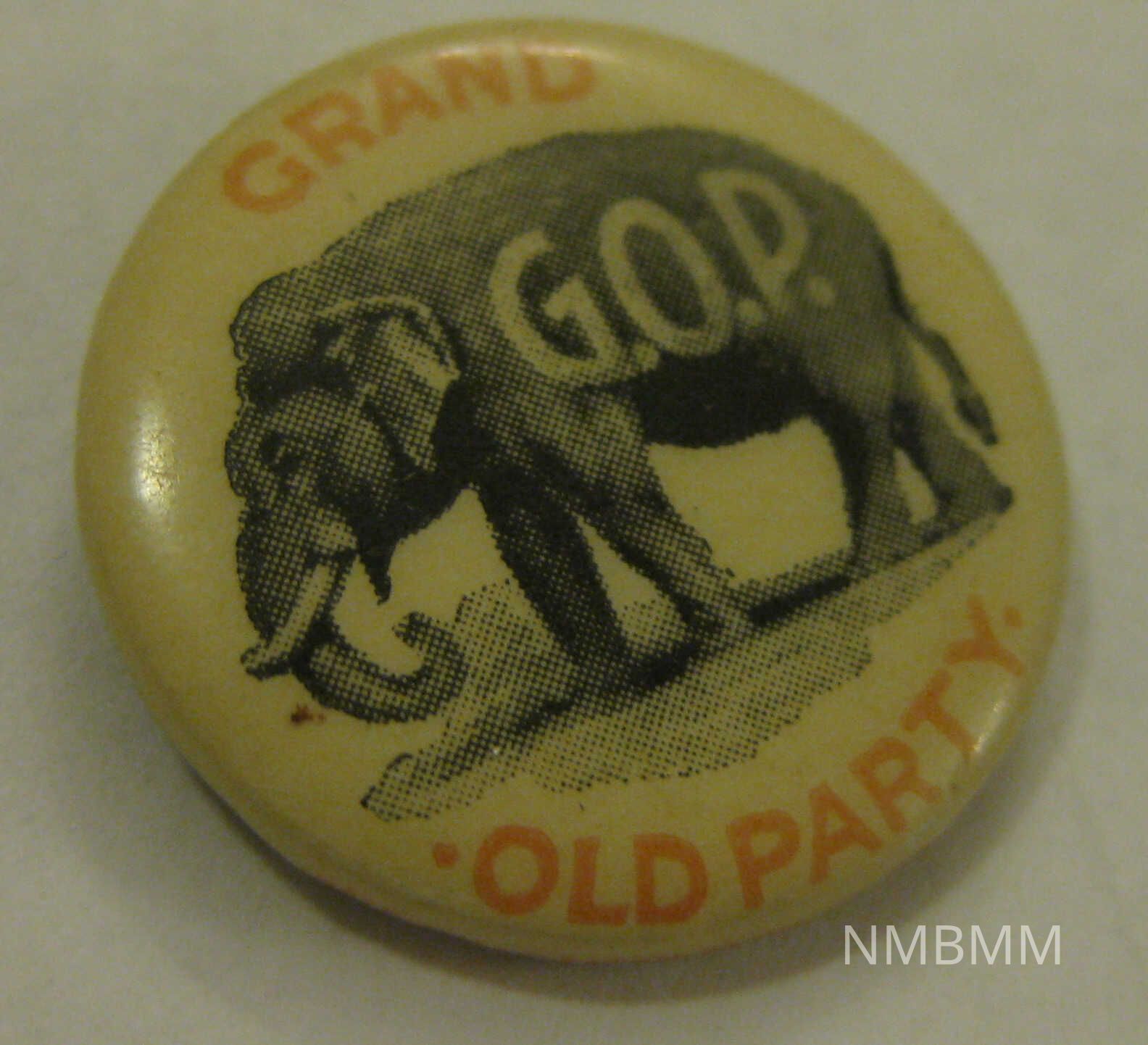 The item is a white pin with an elephant sketch in the center. The red text on the outside reads "Grand Old Party, G.O.P." Part of the back of the pin in broken off. Made by the Baldwin Gleason Co., L.D. N.Y. 3/4" in diameterCollection