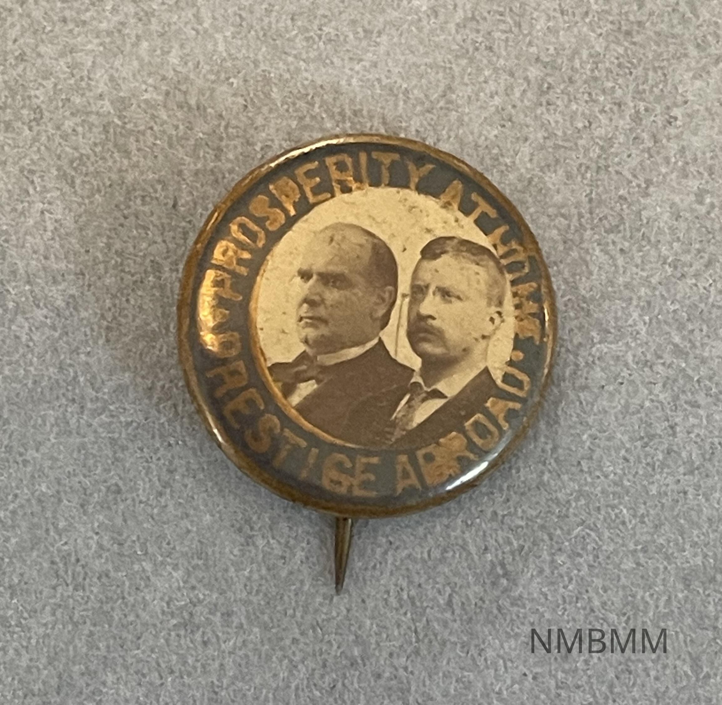 The item is a small pin that features images of McKinley and Roosevelt. It has a navy blue border and gold text that reads "Prosperity at Home. Prestige Abroad."
