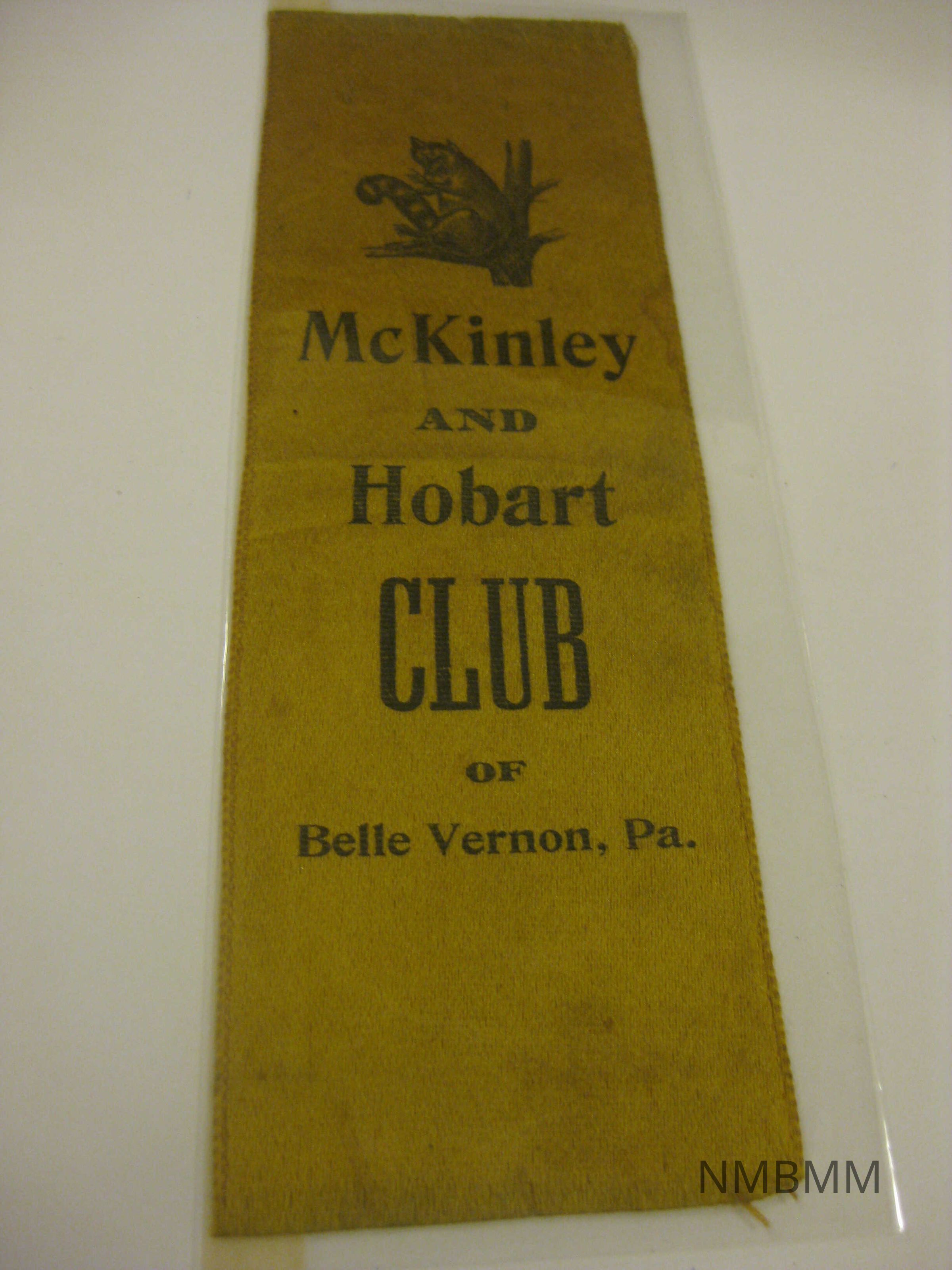 The item is a yellow ribbon with black text and design. The text reads "McKinley and Hobart Club of Belle Vernon, Pa." There is a picture of a raccoon at the top. Dirty and frayed. Measures 6" by 1 7/8" wideCollection