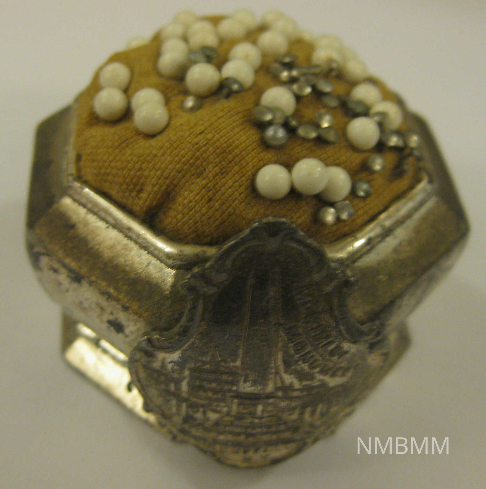 The item is a silver pincushion with an emblem from the Buffalo McKinley Memorial on the front. The yellow top still holds multiple pins and the sides are badly tarnished. The bottom has the marking "J.B.".Collection