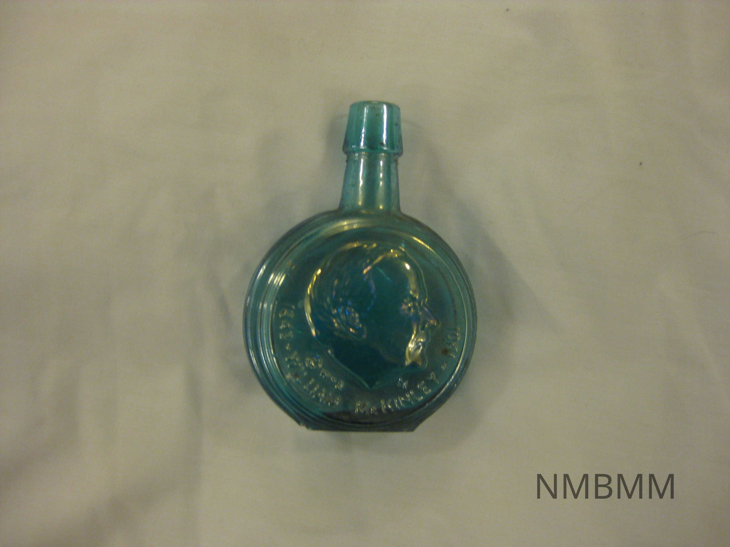 The item is a small blue colored bottle with an image of McKinley's profile on the front. The text on the front reads "1843-William McKinley-1901". The text on the back of the bottle reads "25th President of the United States. 1897-1901. William McKinley. 'Remember the Maine'".
