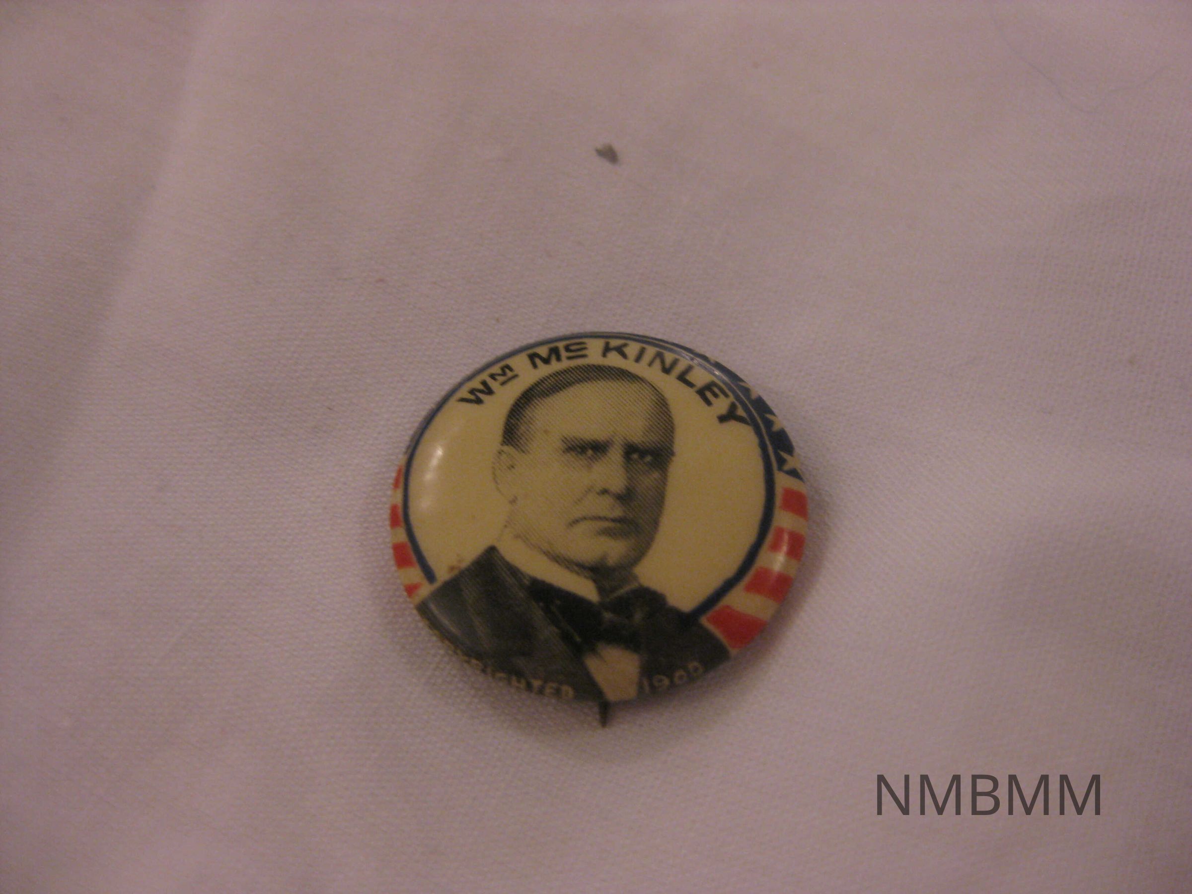 The item is a small button with a black and white image of McKinley in the center with black text above it that reads "Wm. McKinley". There is a small American flag border around most of the outside.Collection