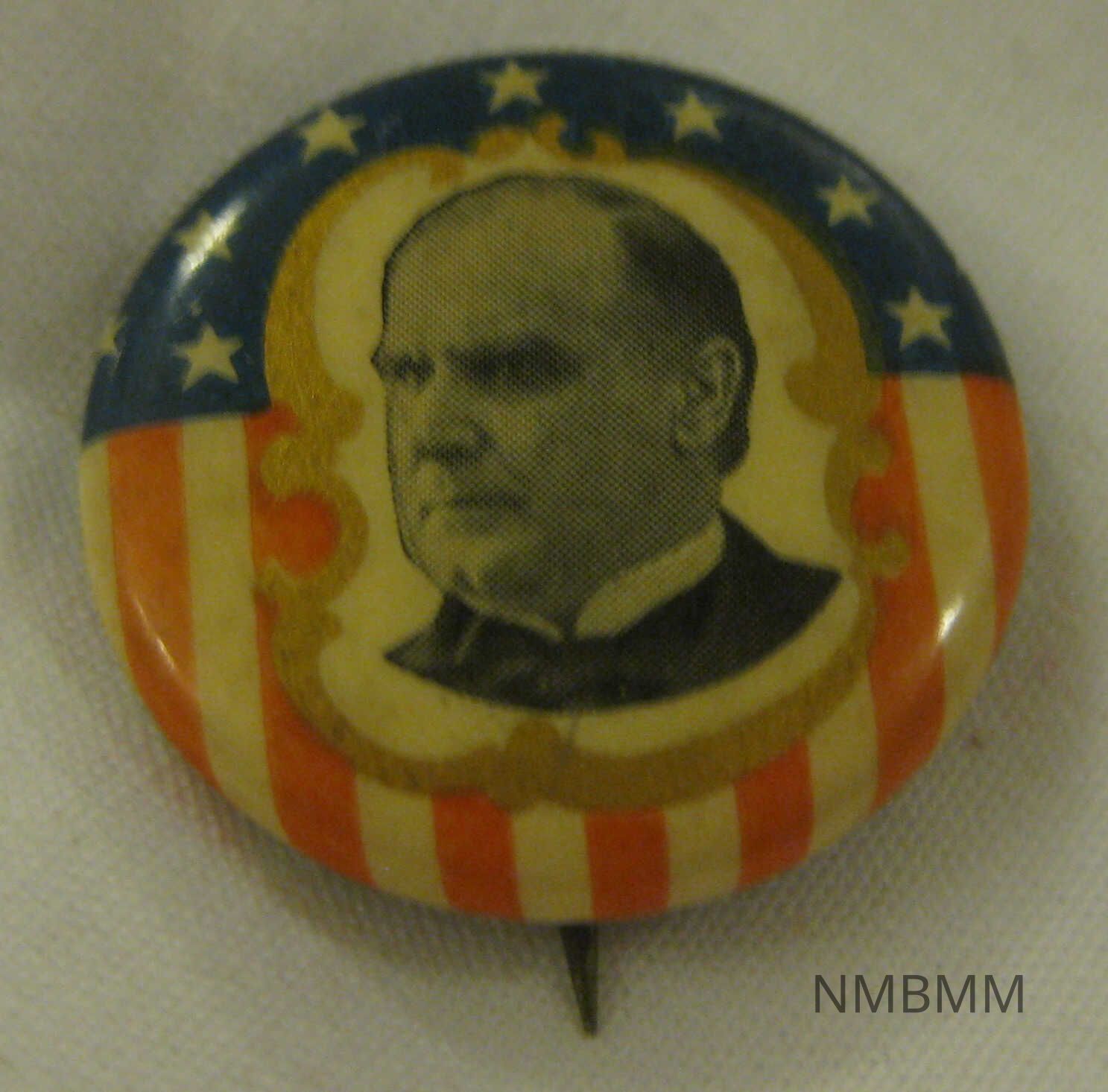 The item is a straight back pin with a black and white image of McKinley in the center on a white background with gold trim and an American flag background. The back reads "Patented Aug. 8th, '99".Collection
