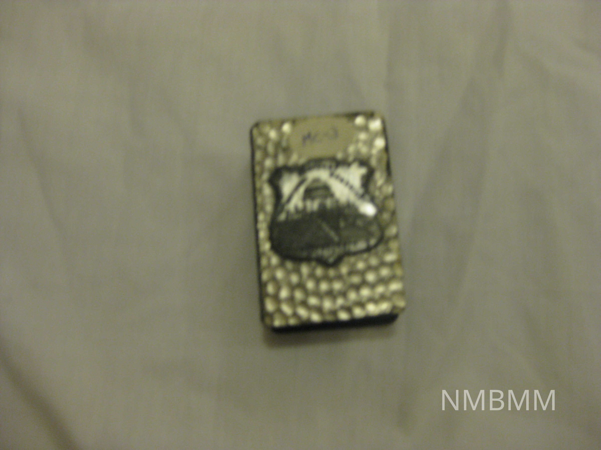 The item is a silver clip or covering. It has a scalloped design all over the outside and an emblem for the McKinley National Memorial on the front. The text reads "National McKinley Memorial, Canton, Ohio." Emblem is badly tarnished. 1.5" by .75" by 2.6"Collection