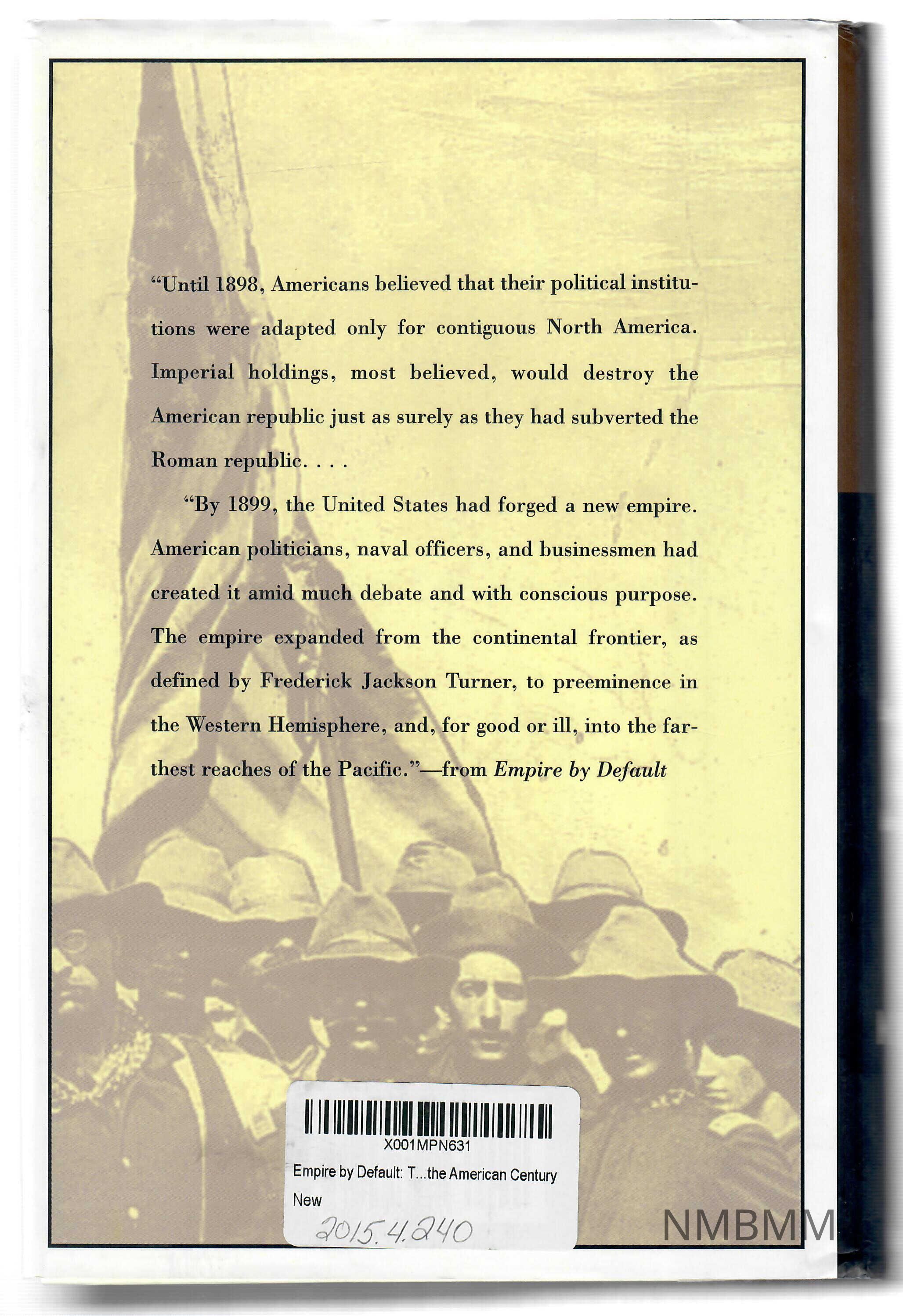 ''By 1899, the United States had forged a new empire. American politicians, naval officers, and businessmen had created it amid much debate and with conscious purpose. The empire expanded from the continental frontier, as defined by Frederick Jackson Turner, to preeminence in the Western Hemisphere, and, for good or ill, into the farthest reaches of the Pacific.''-from Empire by Default