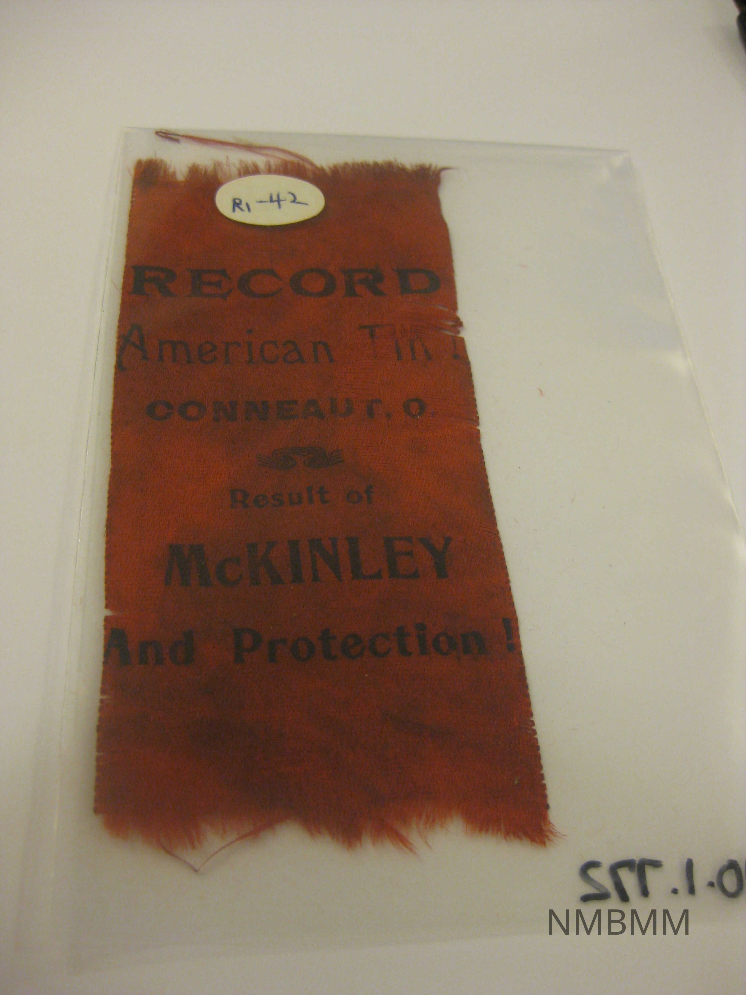 The item is a red ribbon with black text reading "Record American Tin! Conneaut, O., Result of McKinley and Protection!"Collection
