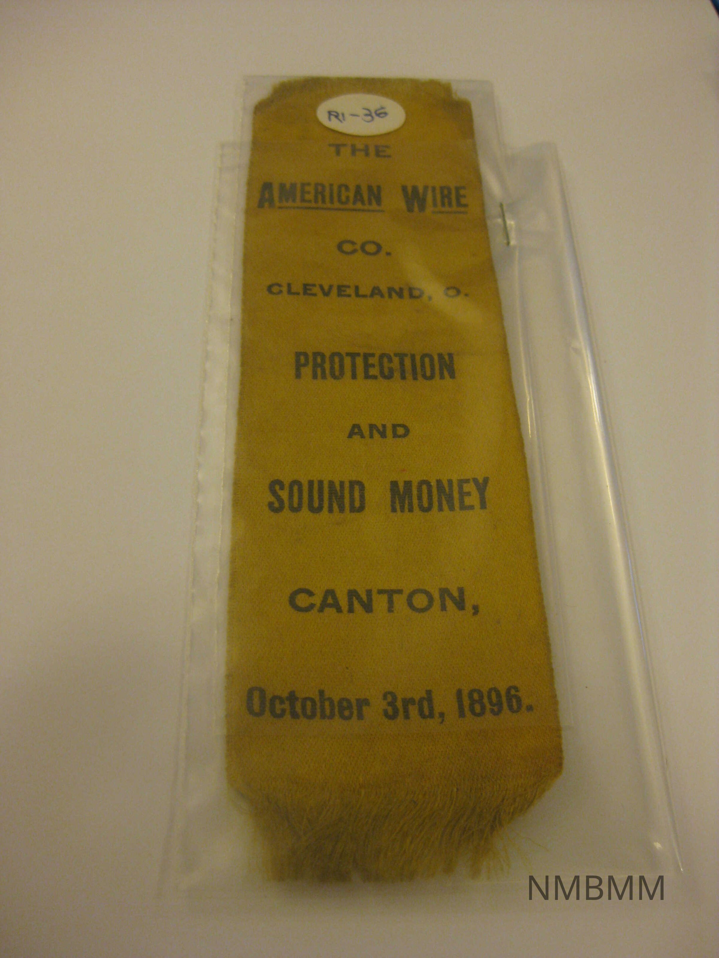 The item is a yellow ribbon with black text "The American Wire Co., Cleveland, Ohio. Protection and Sound Money. Canton, Oct. 3, 1896." 6 3/4 x 1 7/8 inches.Collection