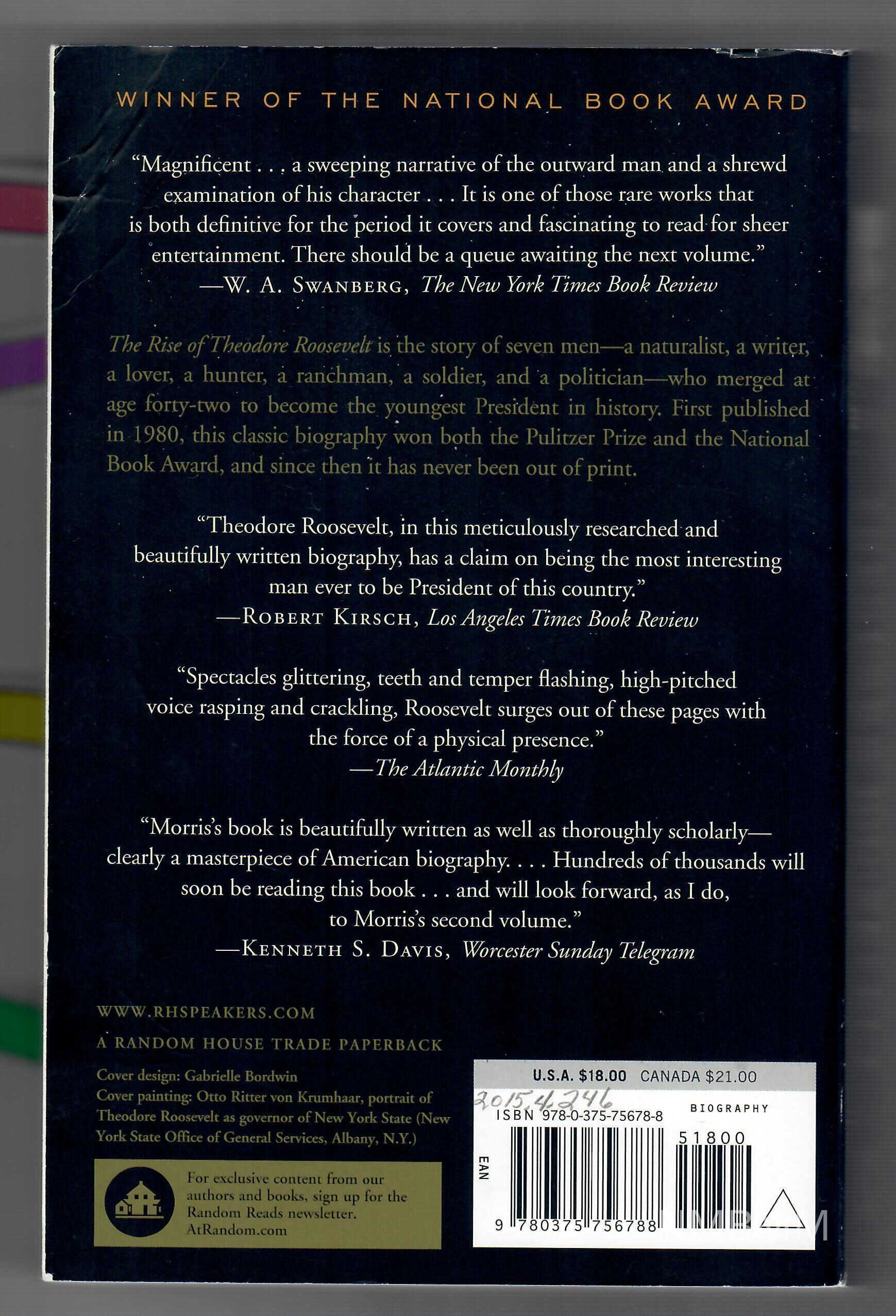 winner of the 1980 Puilitzer Prize and the the National Book Award, this is the beginning of a trilogy of books about the life of Theodore Roosevelt. This is the Random House Trade paperback edition. It does not differ significantly from the original edition, alsthough many passages have been rewriten to include recent Roosevelt scholarship and documentation. Additionally some illustrations were replaced.Collection