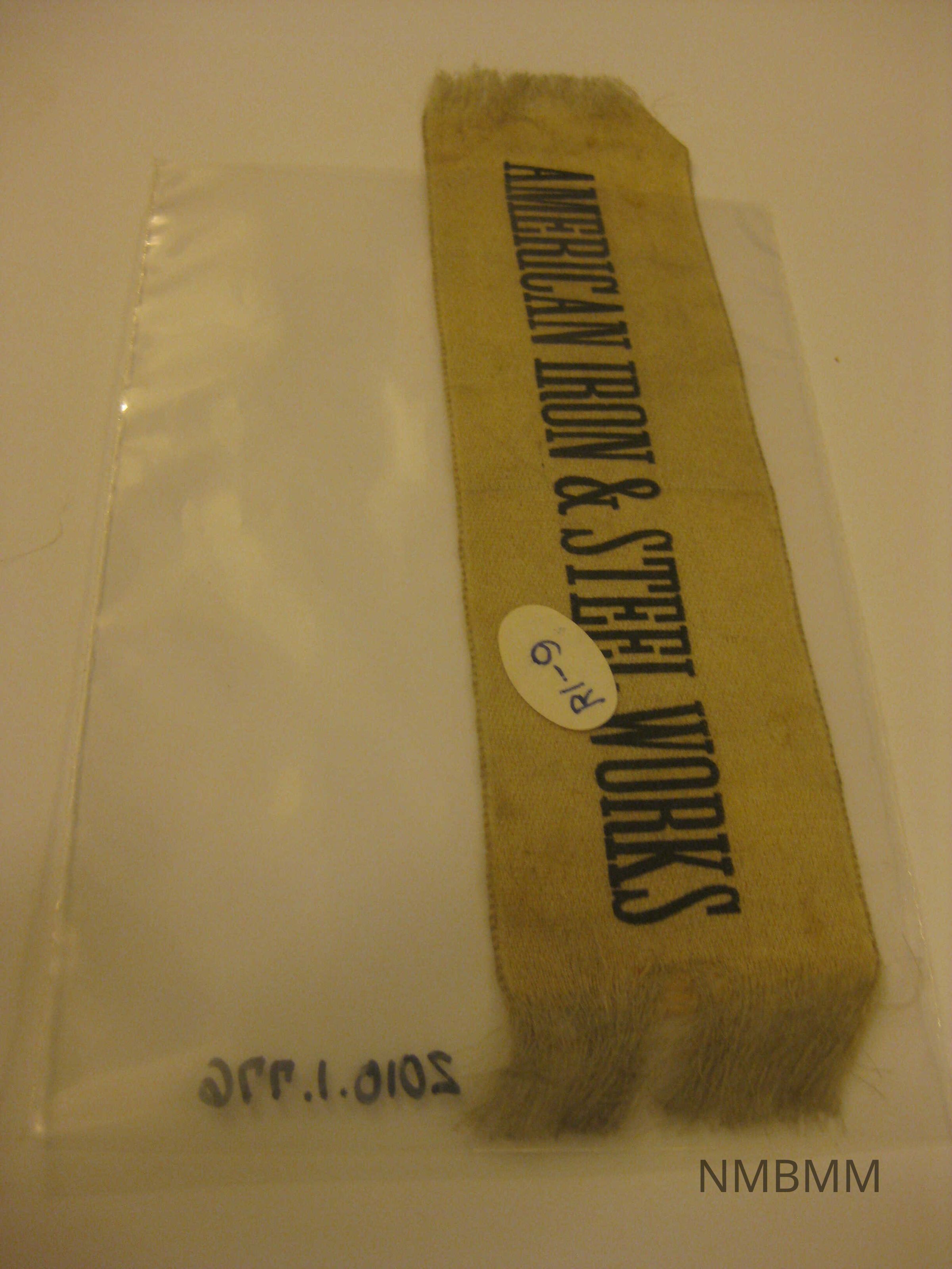 The item is a white ribbon with black text "American Irom and Steel Works." 7 x 1 3/4 inches.Collection