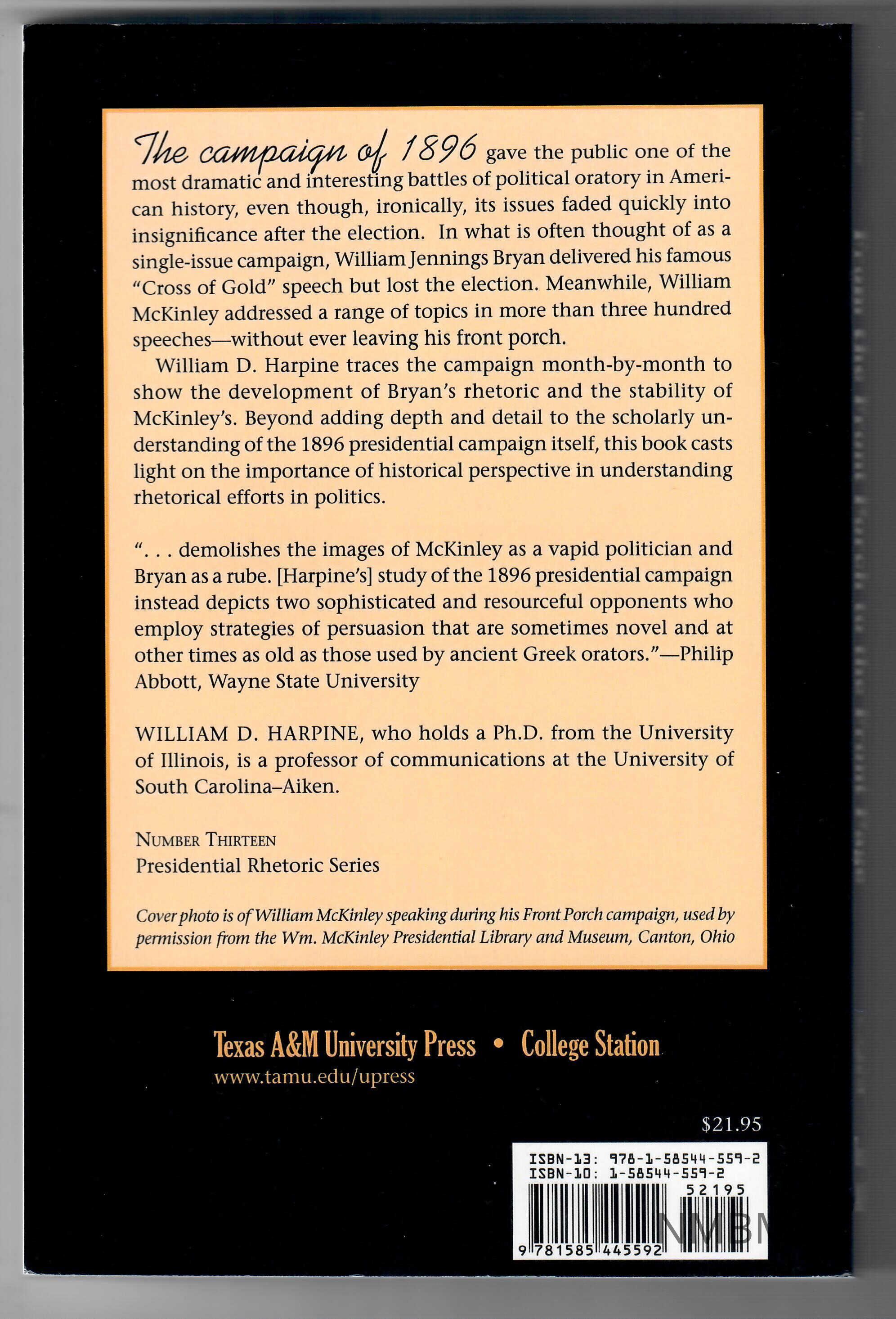 Rhetorical historian Harpine attempts to "show that both McKinley and Bryan presented oral rhetoric of power, ingenuity, and interest. In the end, the public speaking of these candidates stands up for itself. The candidates' oratory possibly had its greatest influence in the press reports of the campaign, rather than thhrough the responses of the live audiences, but the oral quality of the events emerged all the same." the author also attwmpts to determine why this campaign is still very important today.