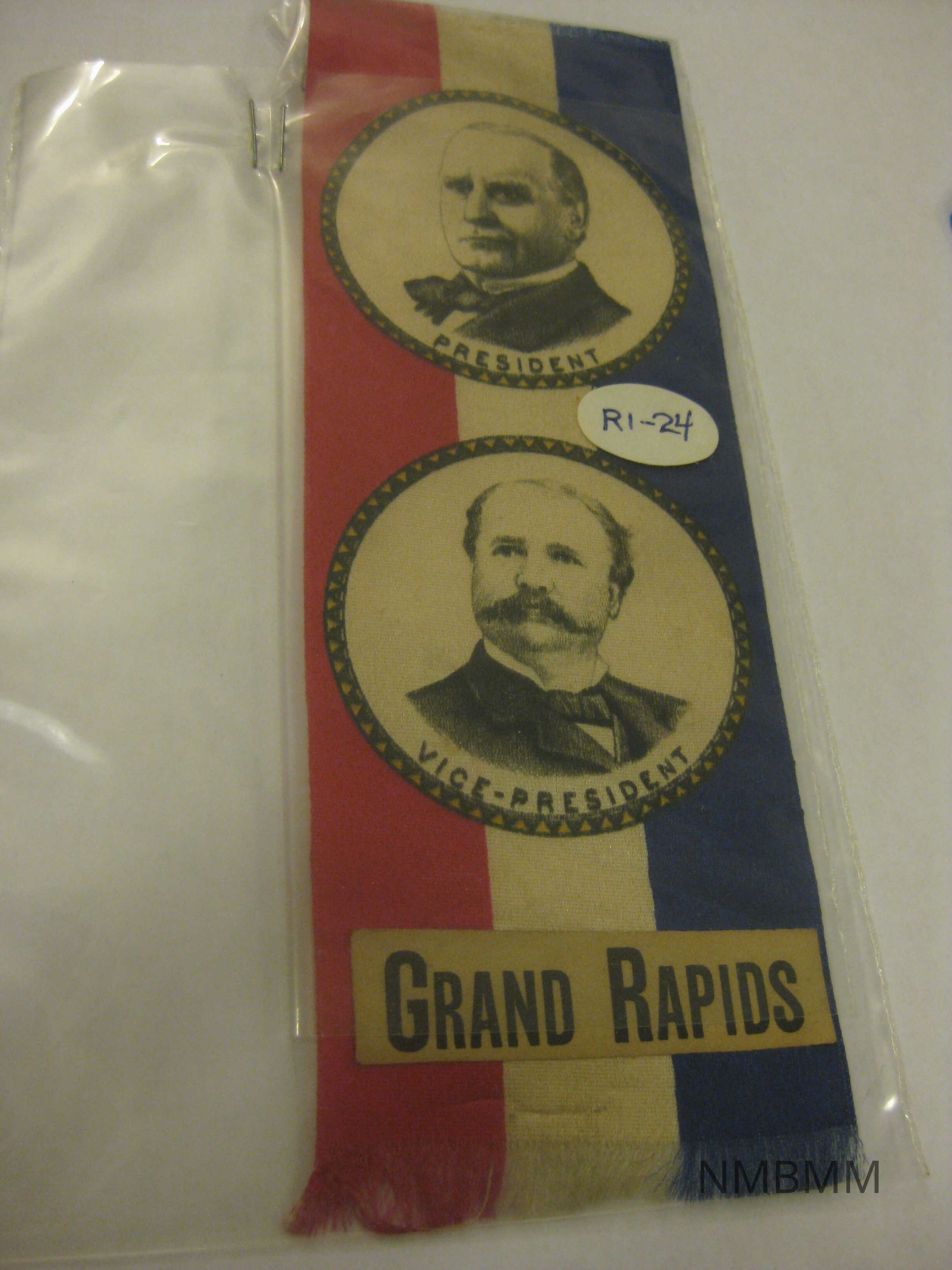 The item is a red, white and blue striped ribbon, black text "President" and "Vice President, Grand Rapids", and images of McKinley and Hobart, 6.75 by 2.25