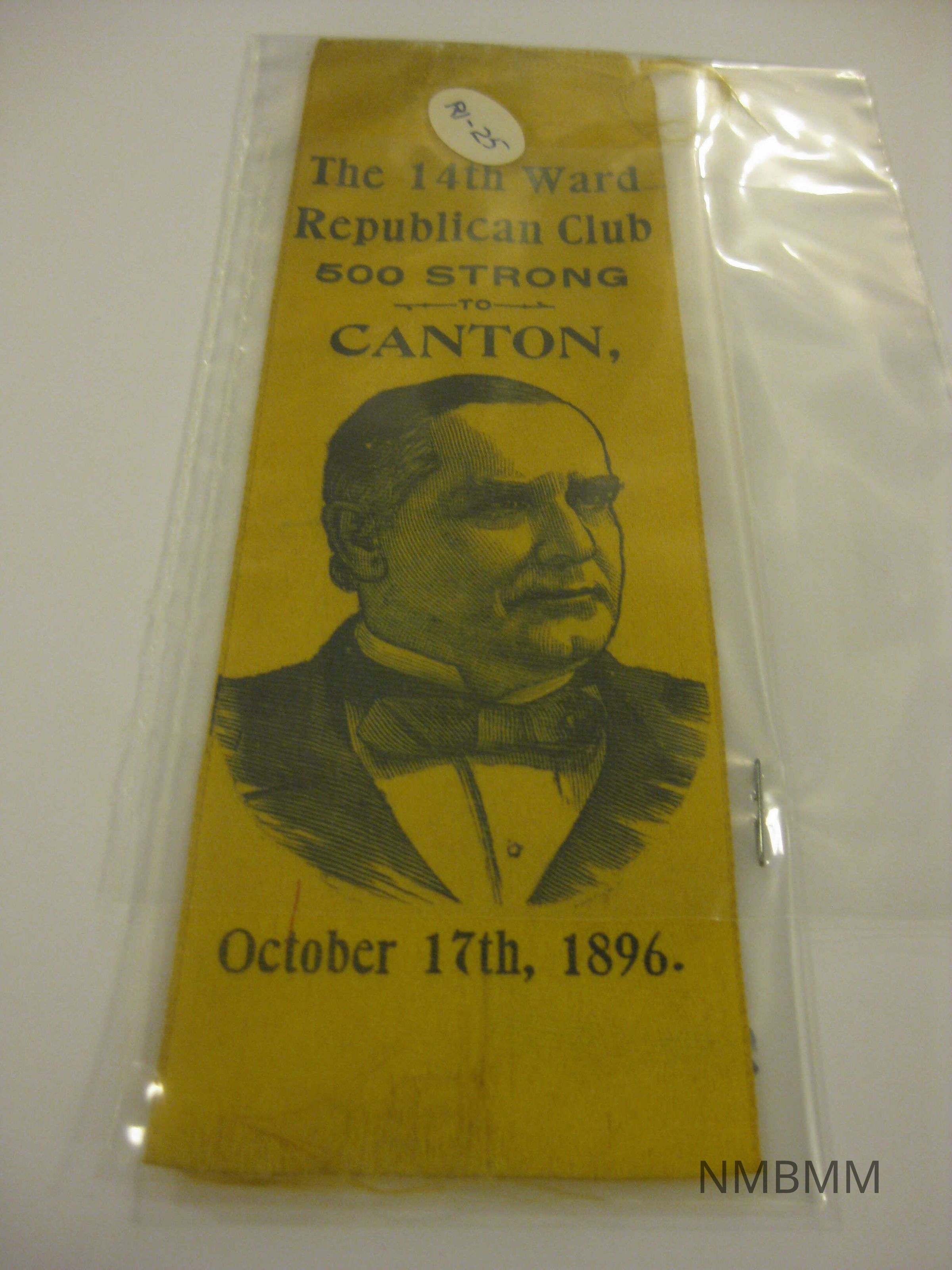 The item is a yellow ribbon with black text that reads "The 14th Ward Republican Club, 500 Strong to Canton, October 17th, 1896." Picture of McKinley in the center. Loose string, some staple markings. 6 7/8 by 2 1/8 inches.