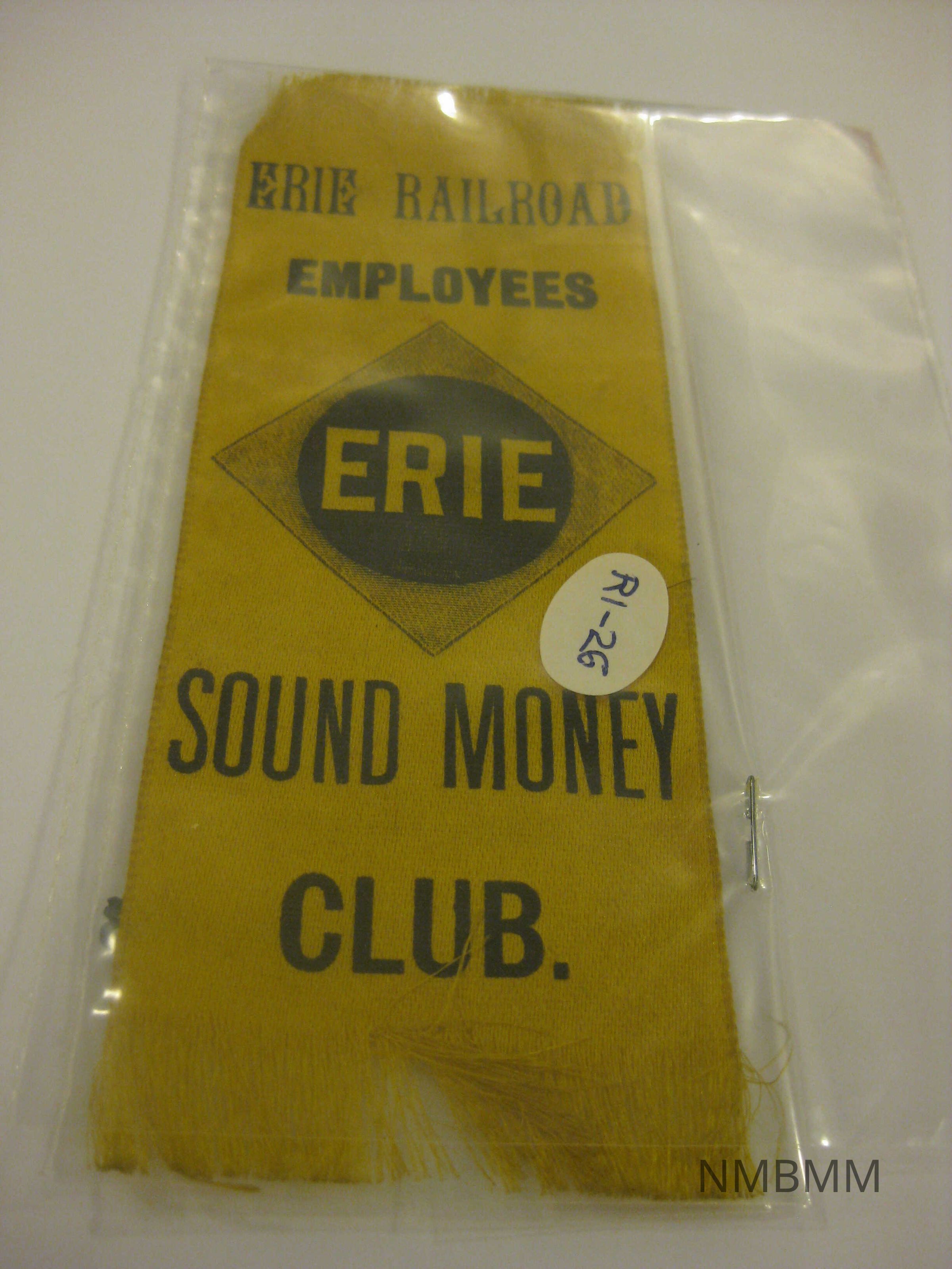The item is a yellow ribbon with black text "Erie Railroad Employees, Sound Money Club". The word "Erie" is in the center inside of a black circle. 6 by 3 1/8"Collection