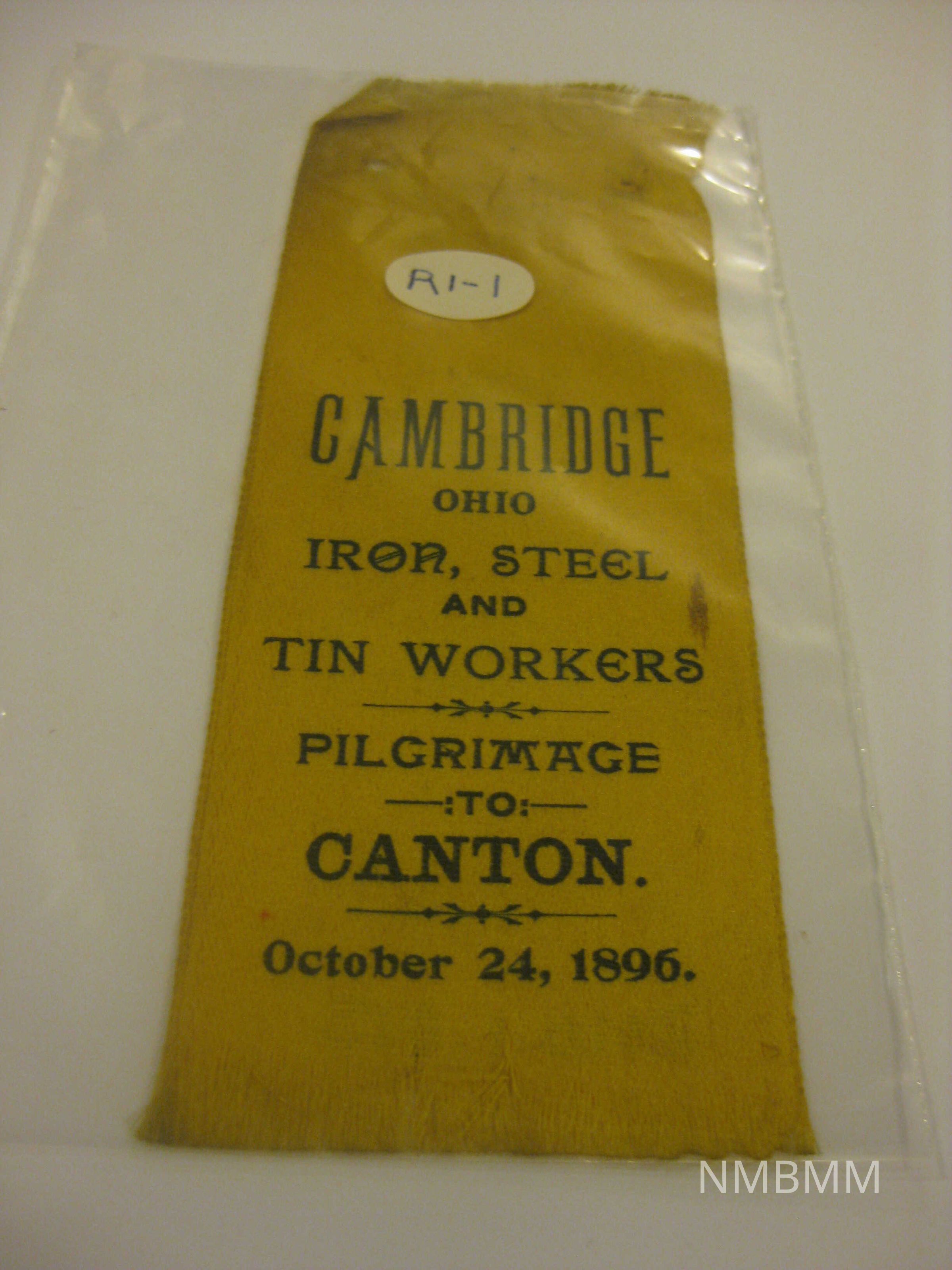 The item is a yellow ribbon with black text "Cambridge, Ohio. Iron, steel and tin workers. Pilgrimage to Canton. October 24, 1896." Holes near the top. 6 by 2.25Collection