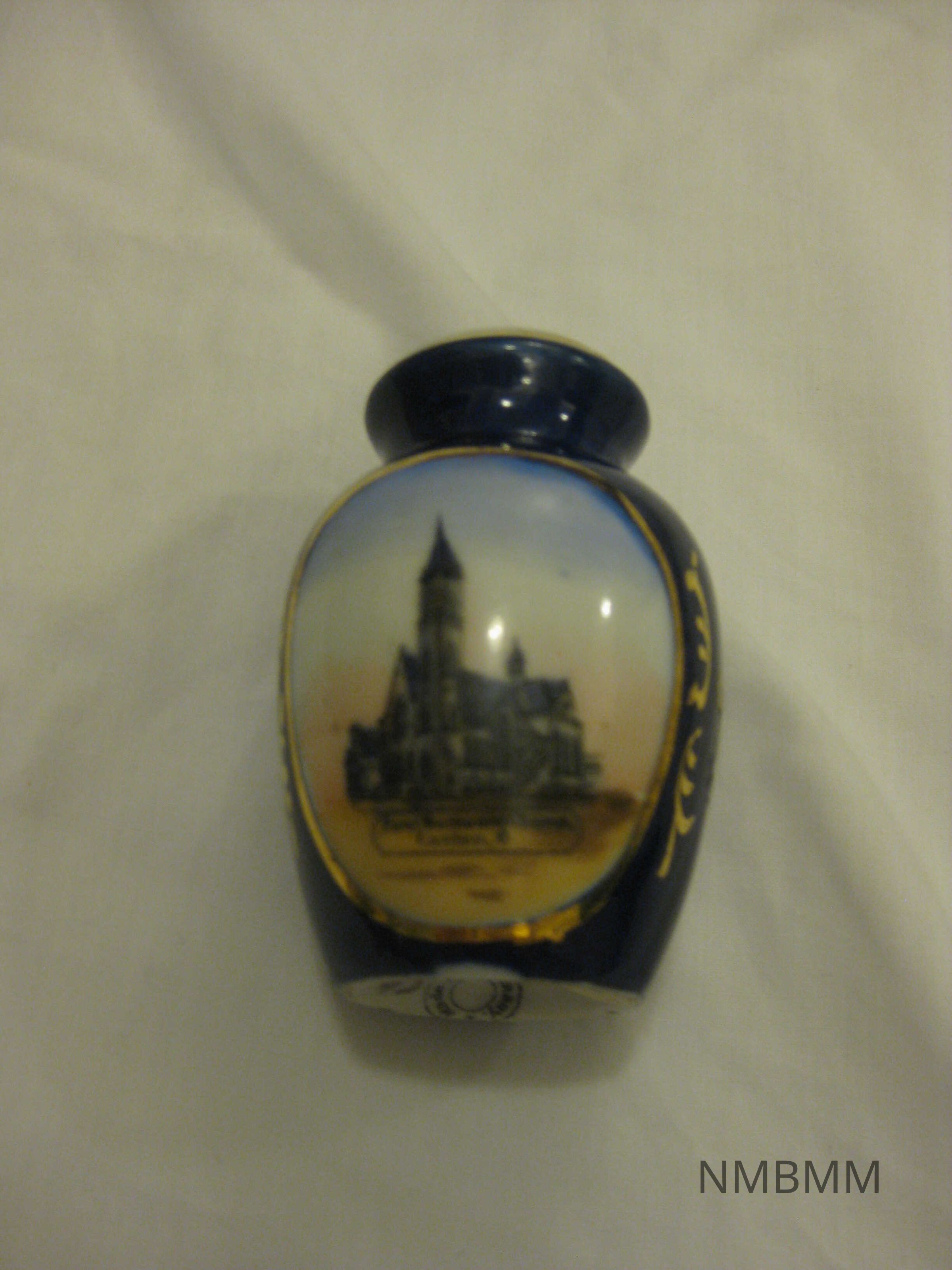 The item is a salt and pepper shaker. It is blue in color with white on the top and a color image of a Methodist church in the center surrounded by a gold border. The text under the picture reads "First Methodist Church, Canton, O." The bottom is stamped, "Made in Germany." 2 by1.5 by 3Collection