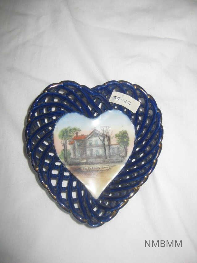 The item is a cobalt blue heart-shaped candy dish with a color image of the McKinley home of Canton in the center. Made by the F.C. Haidet Co. Some of the gold trim is fading. 4 by 4 by 1.25