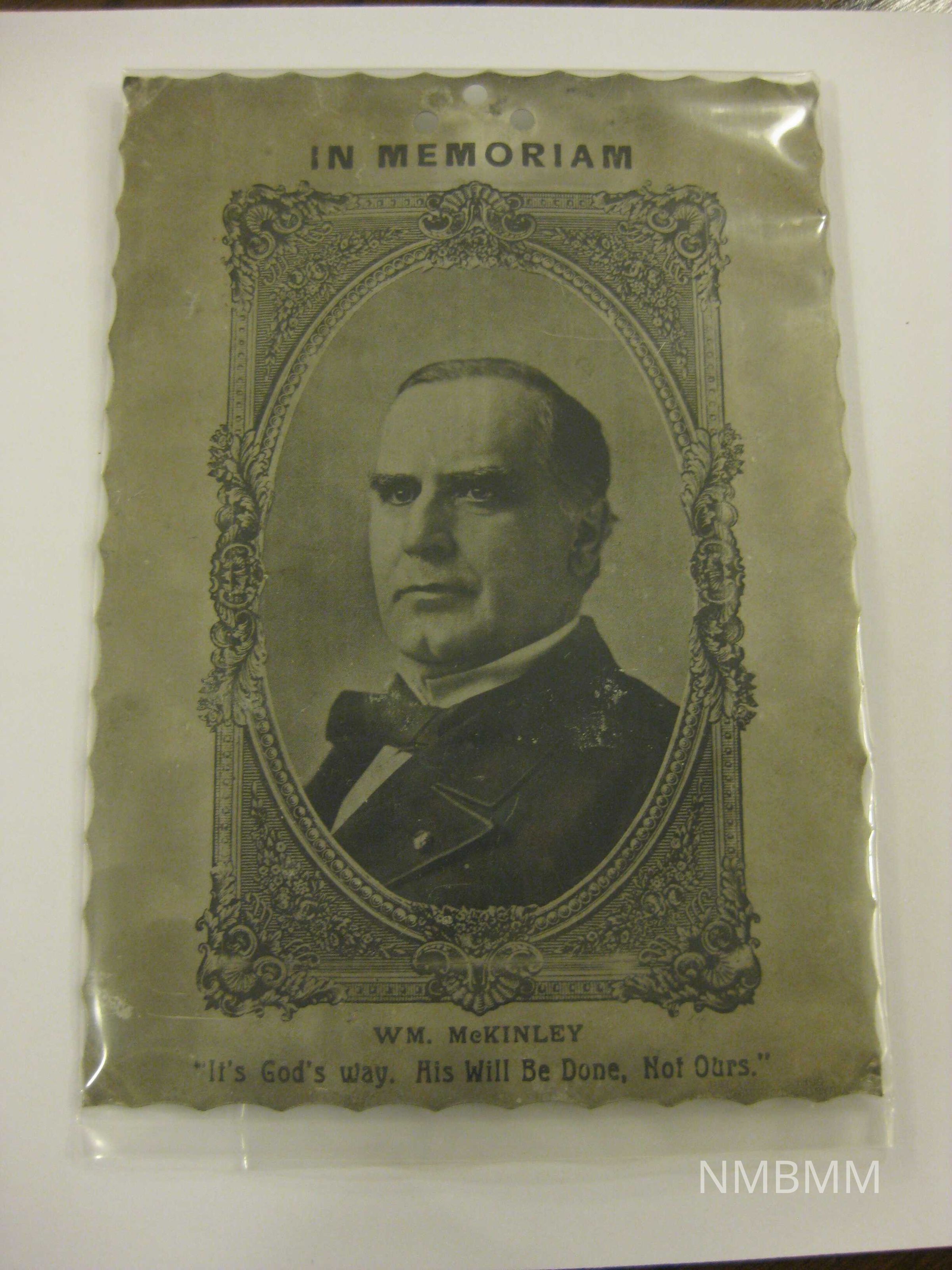 The item is a photographic print of William McKinley that is printed onto aluminum. The caption of the photograph says, "It's God's way. His Will Be Done, Not Ours." The item is covered in plastic wrapping. The marker's mark is on the bottom right hand corner. It was made by N.J. Aluminum Co.Collection