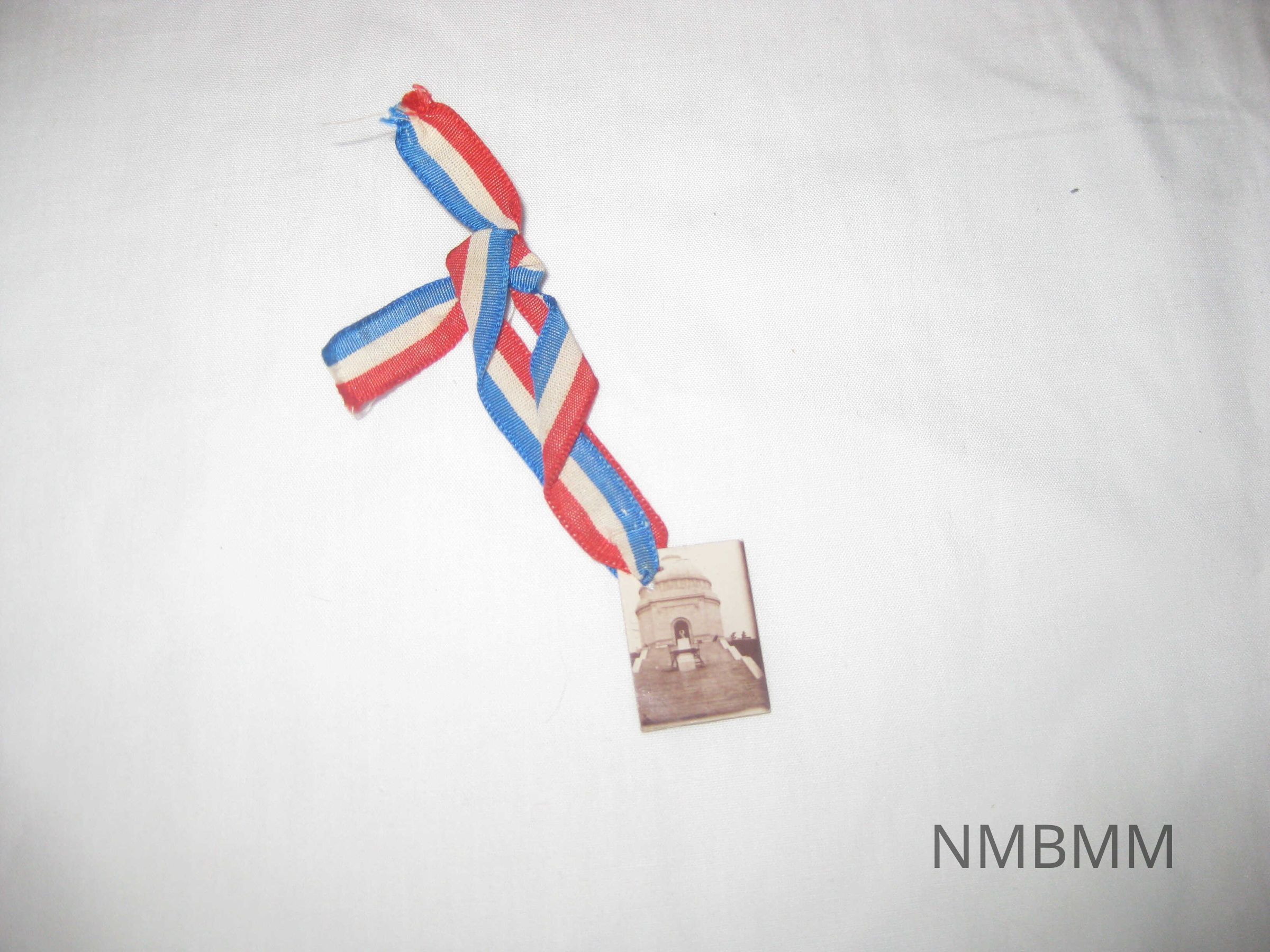 The item is a red, white and blue ribbon tied to an picture that has an image of McKinley on one side and the McKinley Memorial on the other. Very dirty. 3.75 by .75"