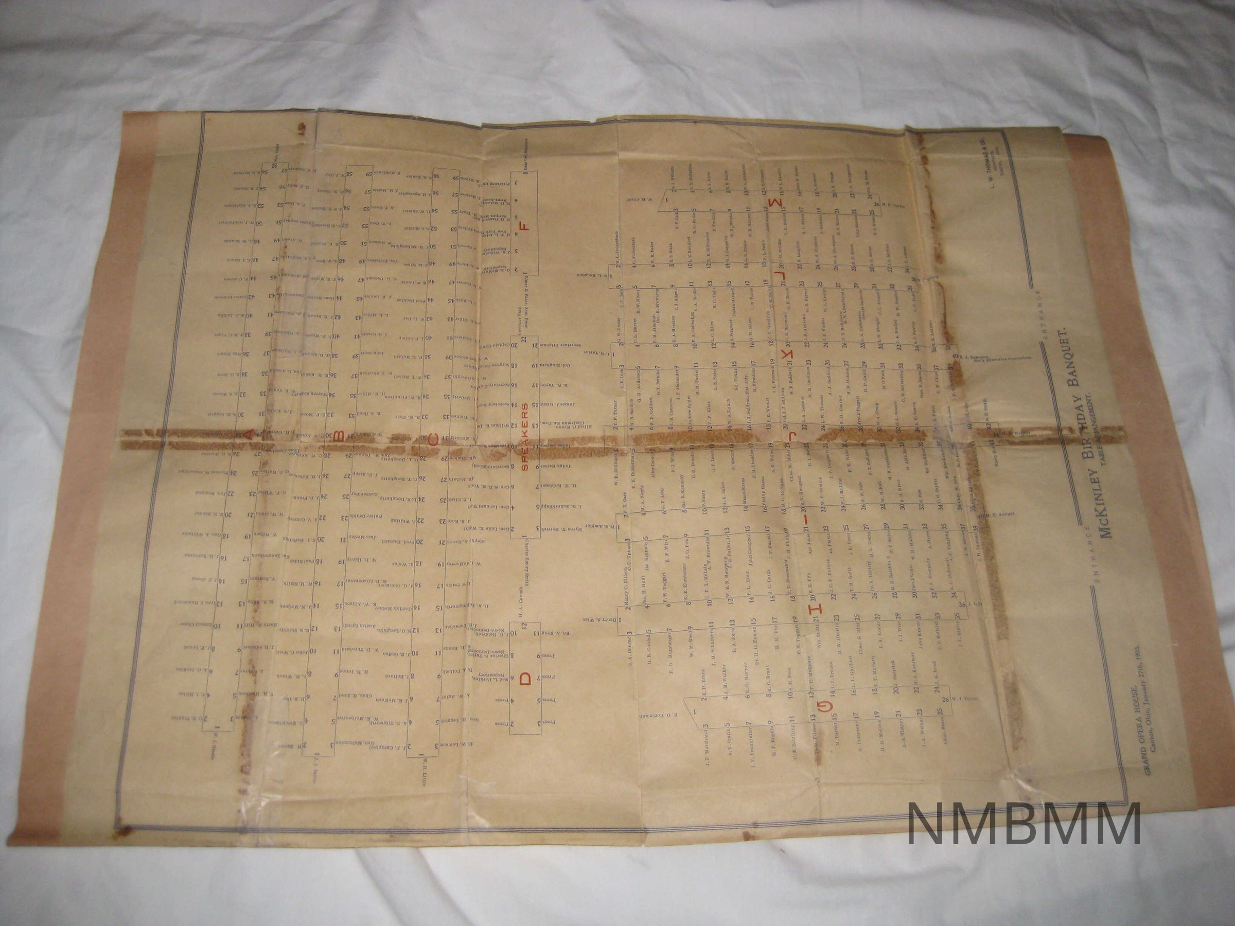The item is a large fold out seating chart of the seating arrangements for McKinley's Birthday Banquet in 1898. There are tears along the creases and some discoloration where it was once taped. 23.25" by 17"Collection