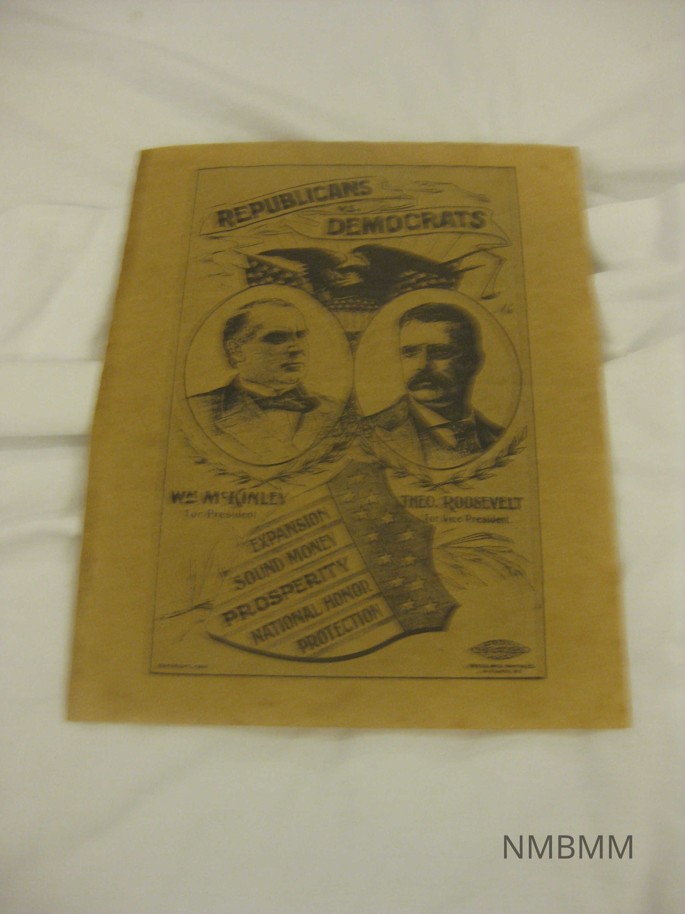 This item is a Republicans vs. Democrats sign with a picture of McKinley and Roosevelt copyrighted in 1900 by the Wetzel Bros. in Milwaukee, Wisconsin. 11 1/8" by 8 3/4".Collection