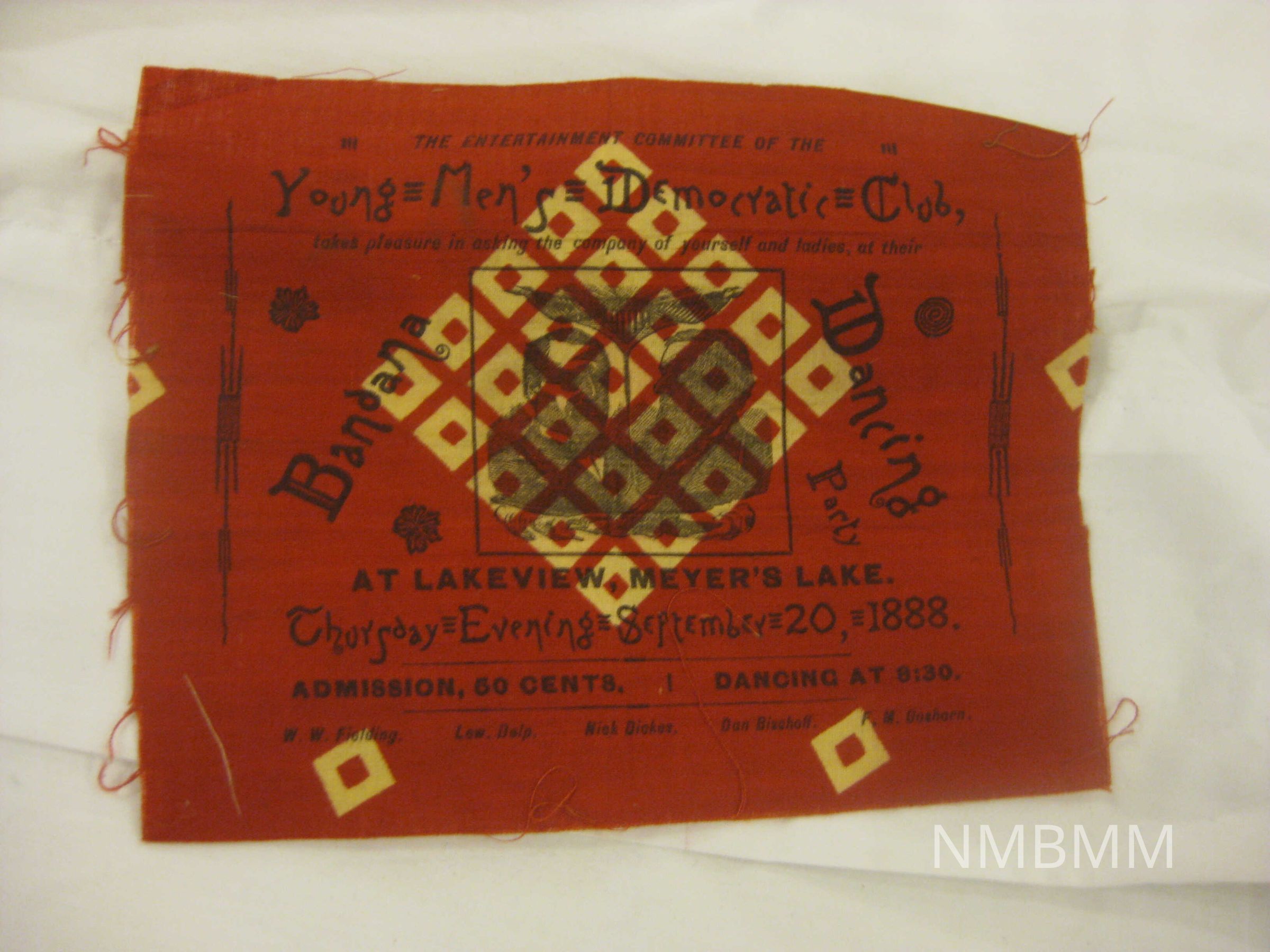 This item is a Young Men's Democratic Club bandana that is red and beige in color with black lettering. It's frayed at the edges and measures 7 by 5.5 inches. Made September 20, 1888.Collection