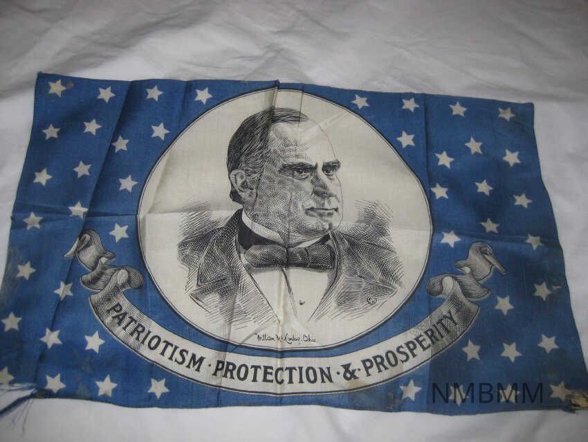 This item is a banner that is blue in color with white stars and a black and white portrait of McKinley in the center with text at the bottom of the portrait that reads"William McKinley, Ohio". The banner beneath the picture reads "Patriotism, Protection and Prosperity." Frayed and torn on the corners. 18 1/8" by 11 3/8"Collection