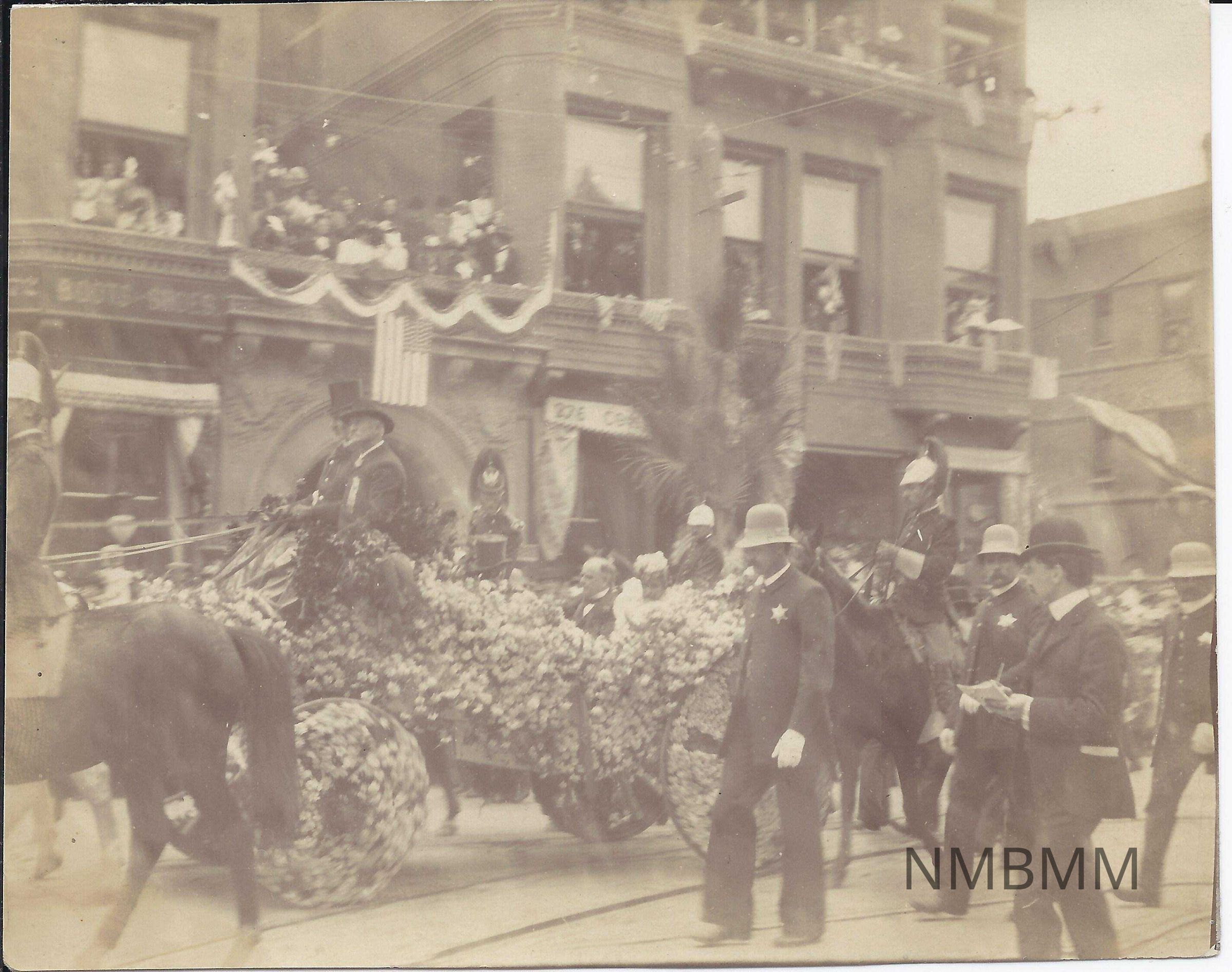 A photograph of Presiden McKinley and his wife, Ida, in a decorated horse drawn carraige during a parade.Collection