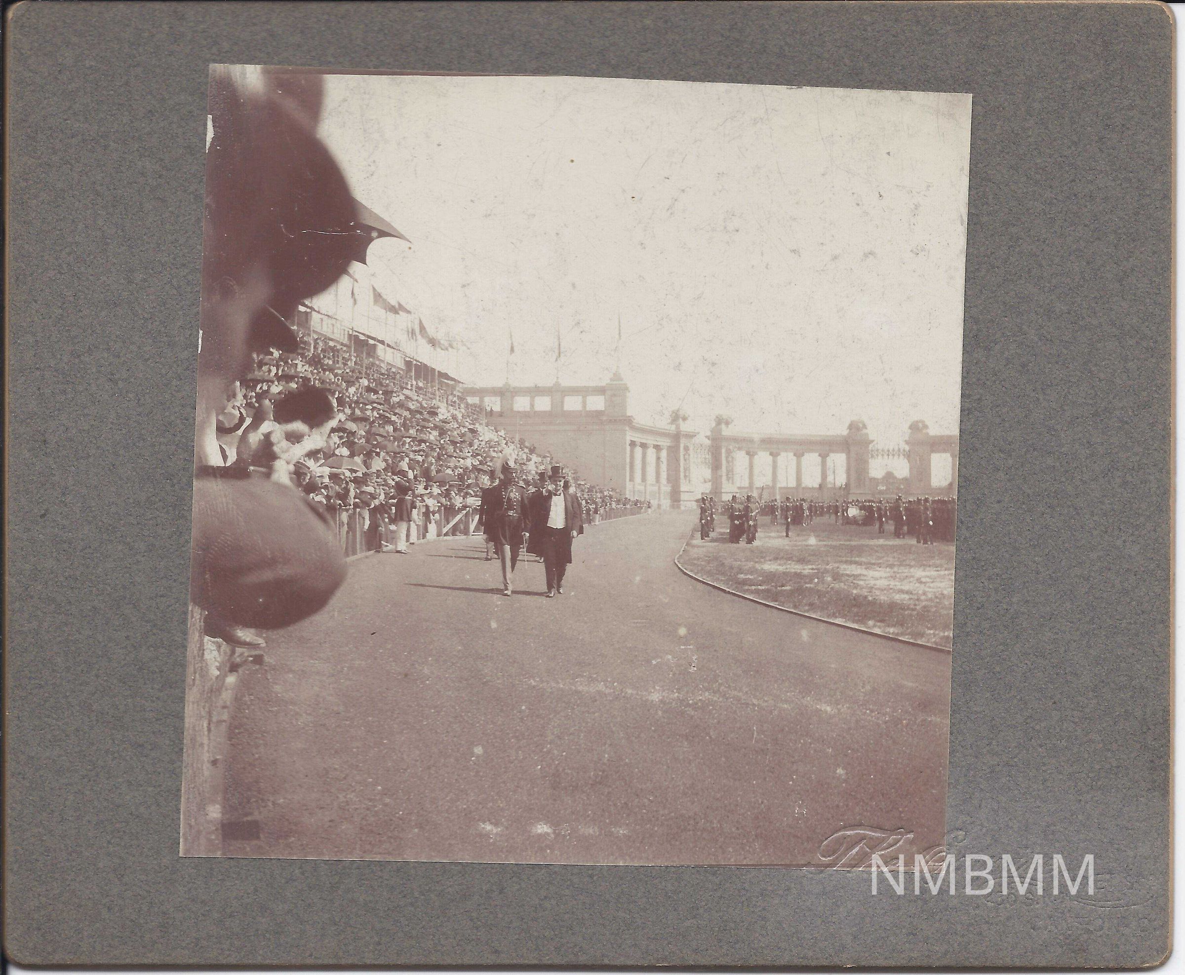 A photograph of Presiden McKinley walking down a race track with a military officer during a celebration.