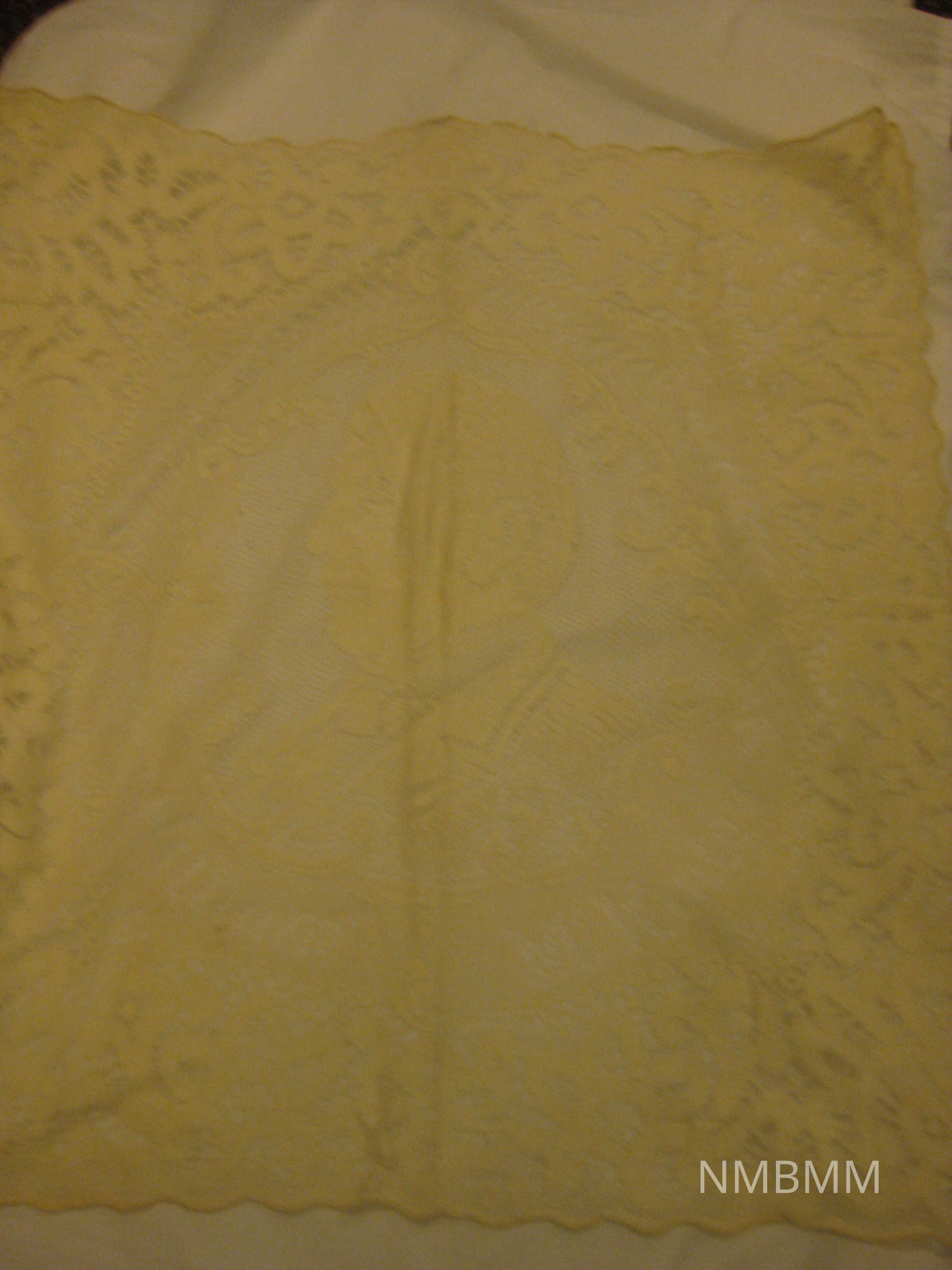 This item is a lace cover with an image of McKinley in the center and his name beneath him. White in color, though many areas have begun to yellow, especially around the edges.33.5" by 31"Collection