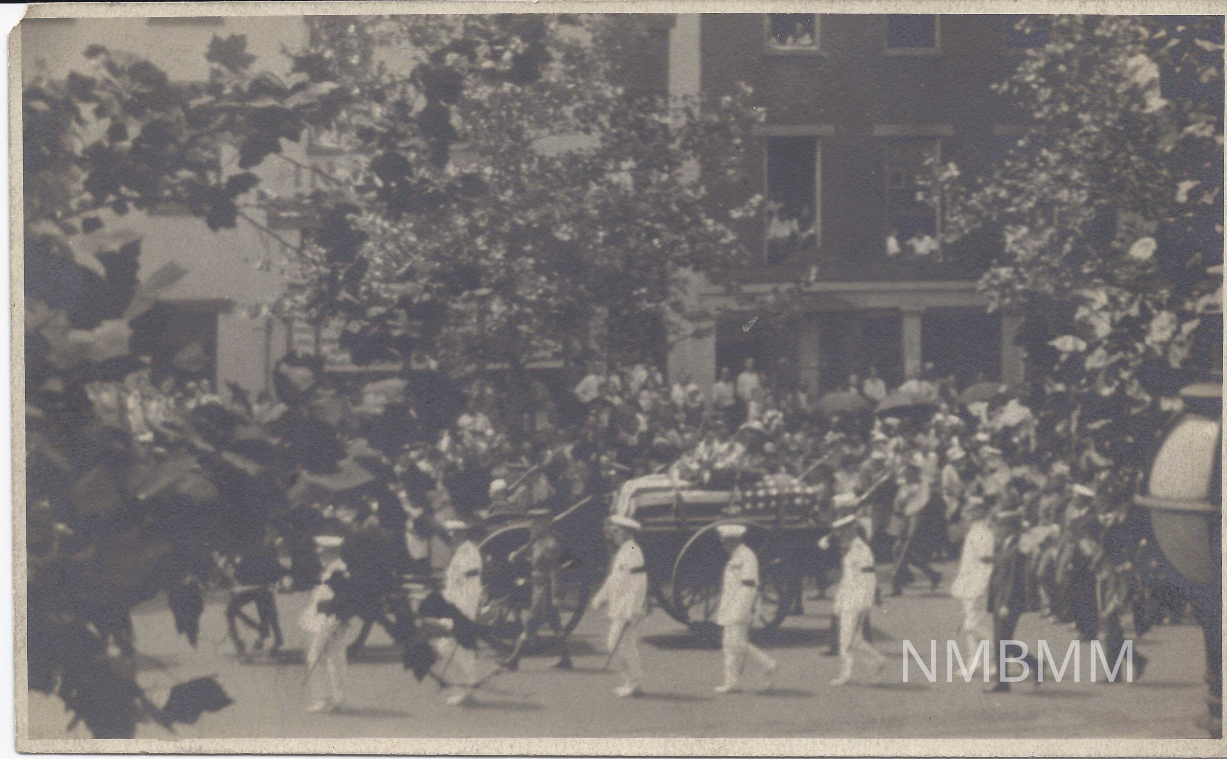 A copy of a photograph showing soldiers walking alongside McKinley's coffin (draped in the United States Flag), in front of spectators.