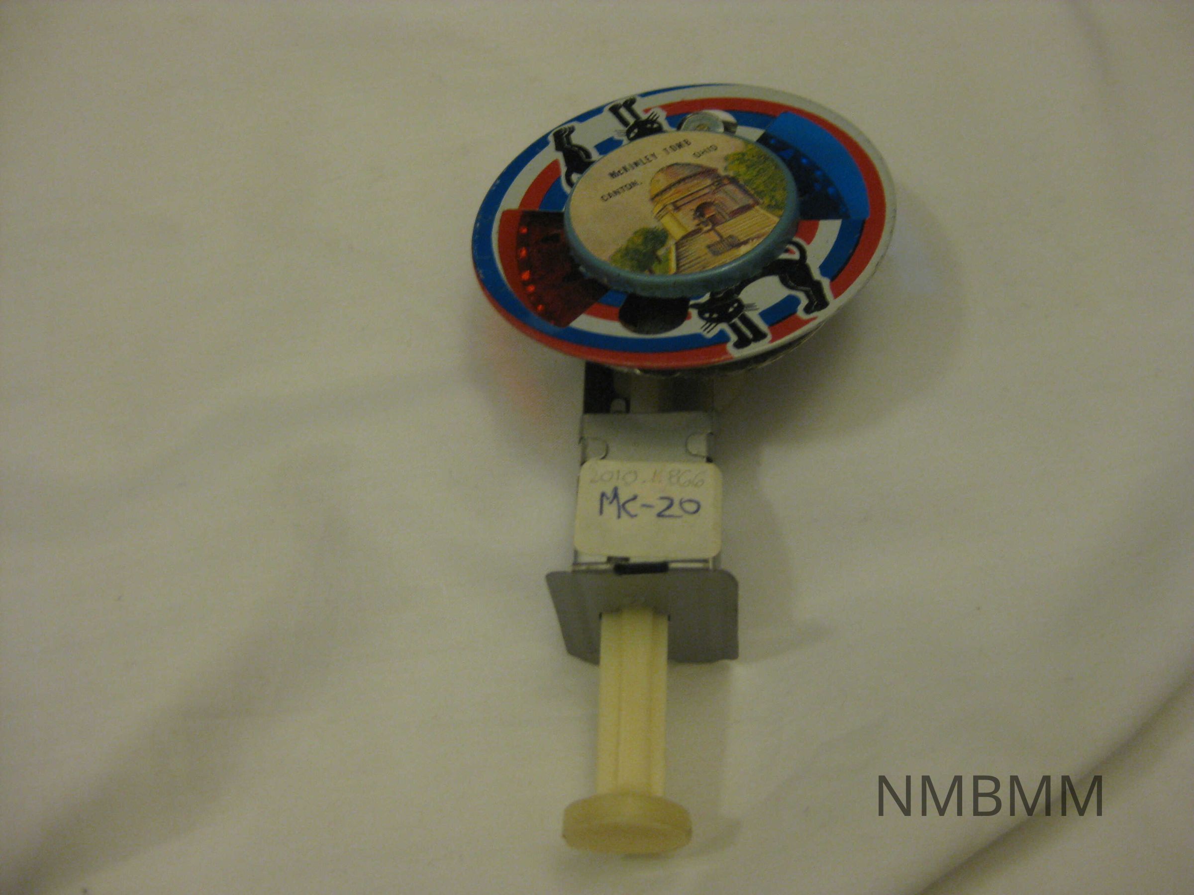 The item is a sparkly whirligig souvenir that features a picture of William McKinley's tomb in Canton and black cats. It is made of tin and plastic. 5 inches tall.