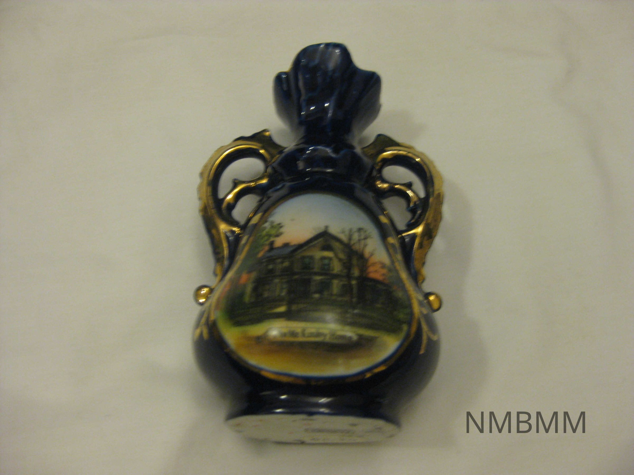 The item is a cobalt blue and gold porcelain bud vase featuring a painted image of the McKinley home in Canton, Ohio. Made by F.C. Haidet in Canton. Measures 3 inches across and 4.25 inches tall.