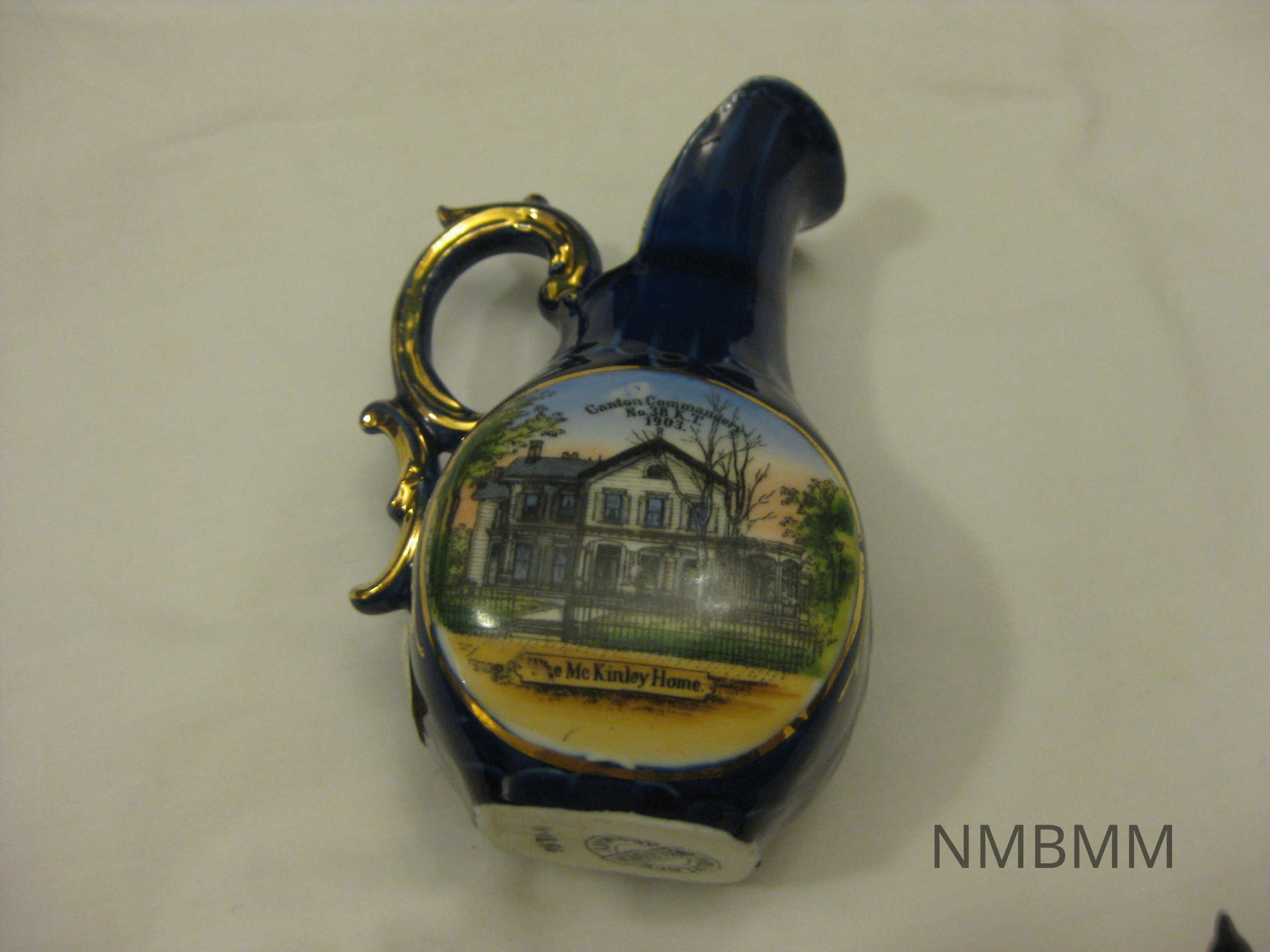 The item is a cobalt blue and gold porcelain creamer pitcher featuring a painted image of the McKinley home in Canton, Ohio. Makers stamp by Wheelock Dresden Germany on bottom. 4 inches tall x 1.5 inches at base. One of a set of two. Text on front, "Canton Commandery No. 38 K.T. 1903.Collection