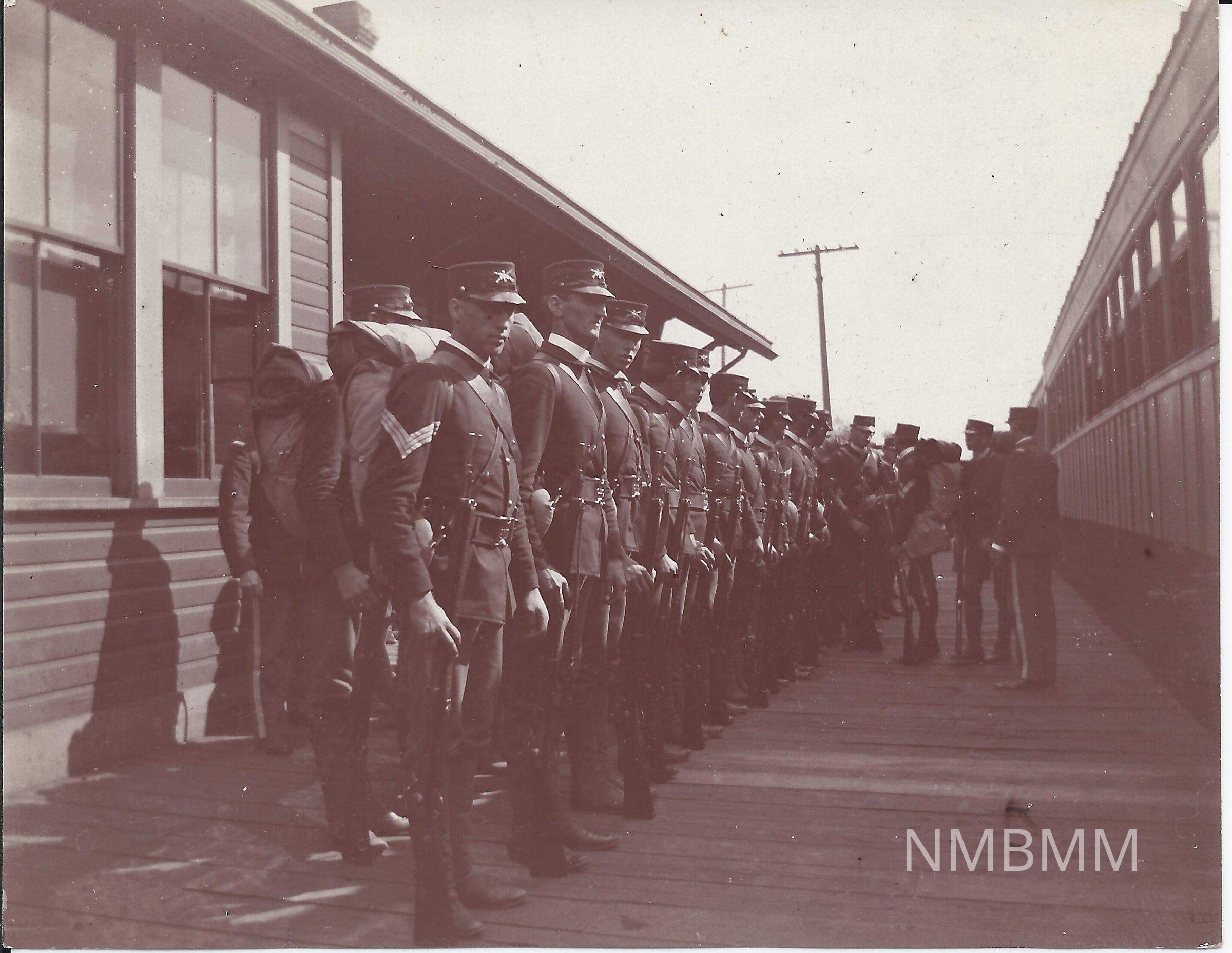 Soldiers standing attention outside of President William McKinley's funeral train.
