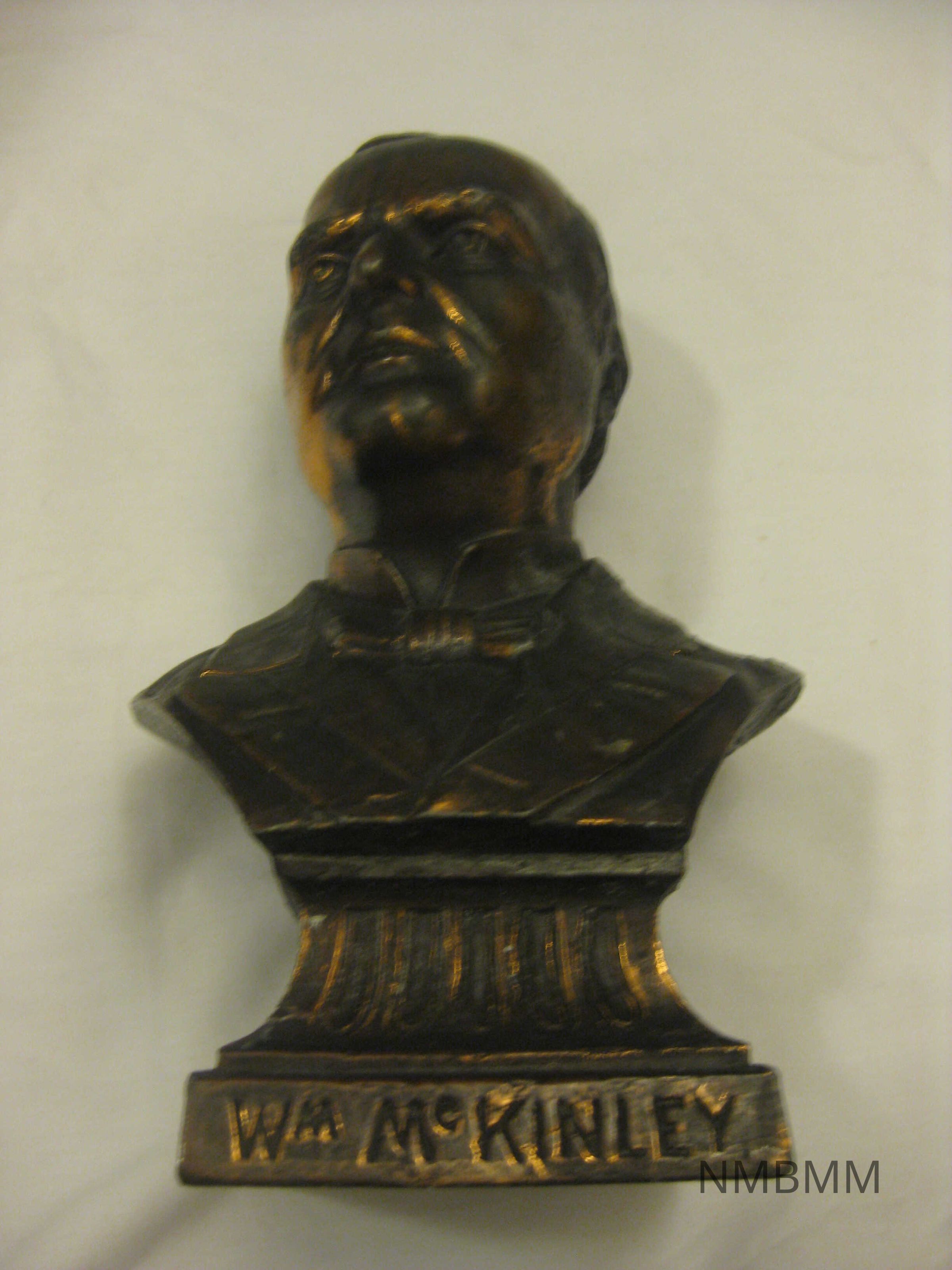 The item is a McKinley bust cast in bronze colored metal. His name is enrgaved on the front. It is copyright NMS & Co 1896 2239 NY. It is 6 3/4 inches tall and 2 7/8 inches wide at the base.Collection