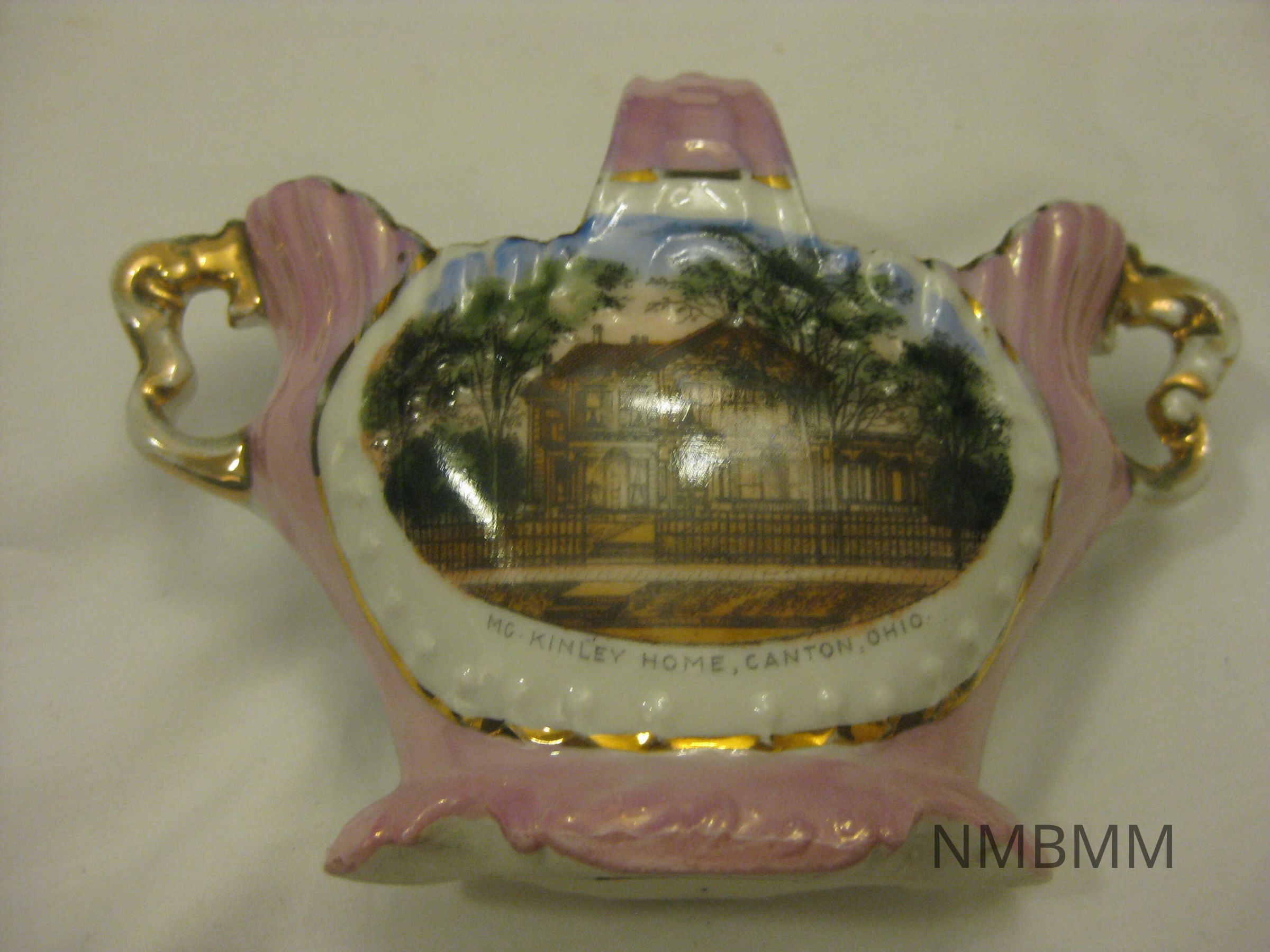 The item is a porcelain basket featuring a colored image of the McKinley home in Canton. The basket is pink, white, and gold. It is 2 7/8 inches at its base and 3 inches tall.Collection