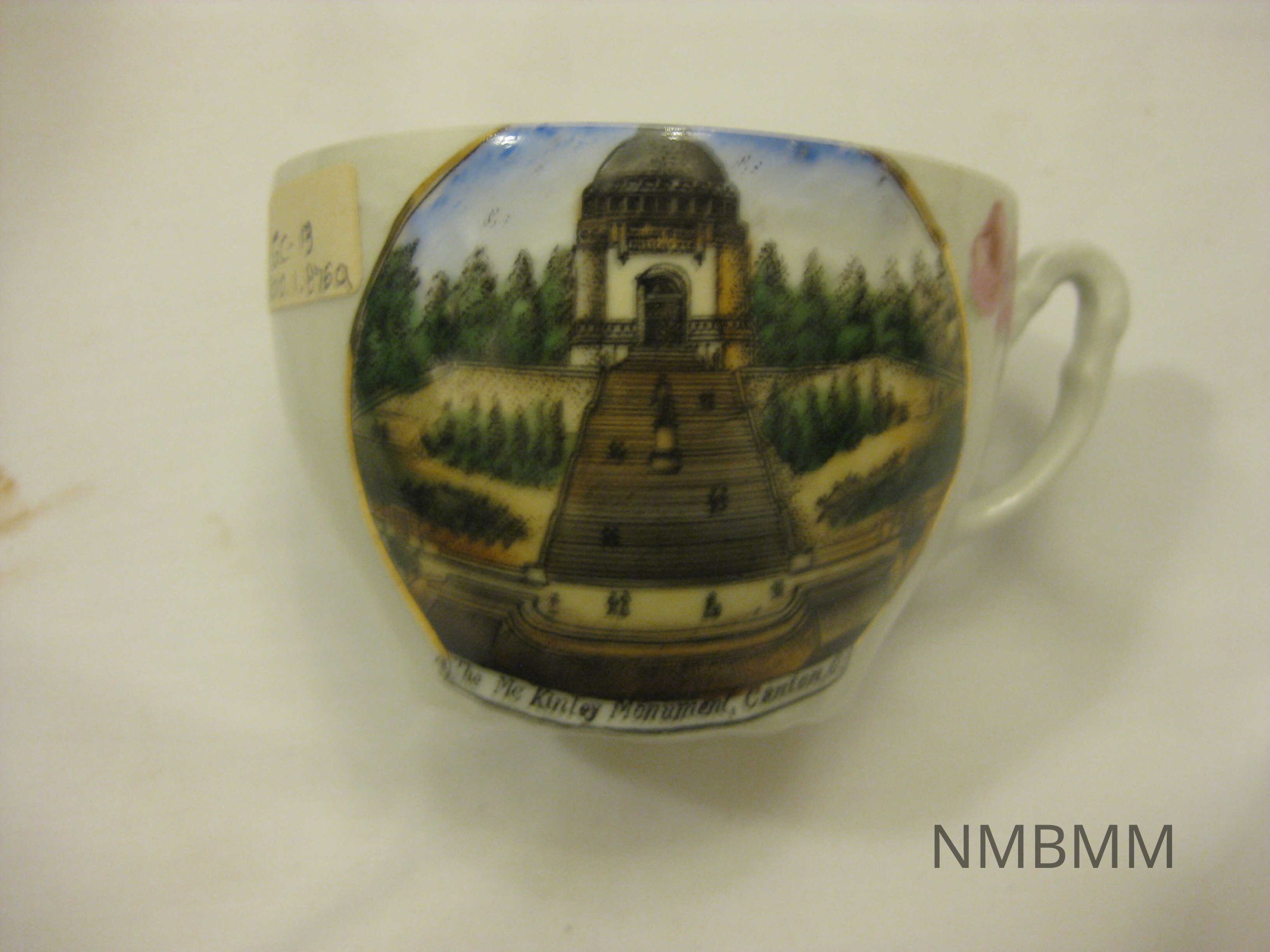 The item is a white porcelain cup featuring a colored image of the McKinley Monument in Canton with a pink floral and gold design. It is 2 7/8 inches in diameter. It also has a matching saucer 2010.1.876b.Collection
