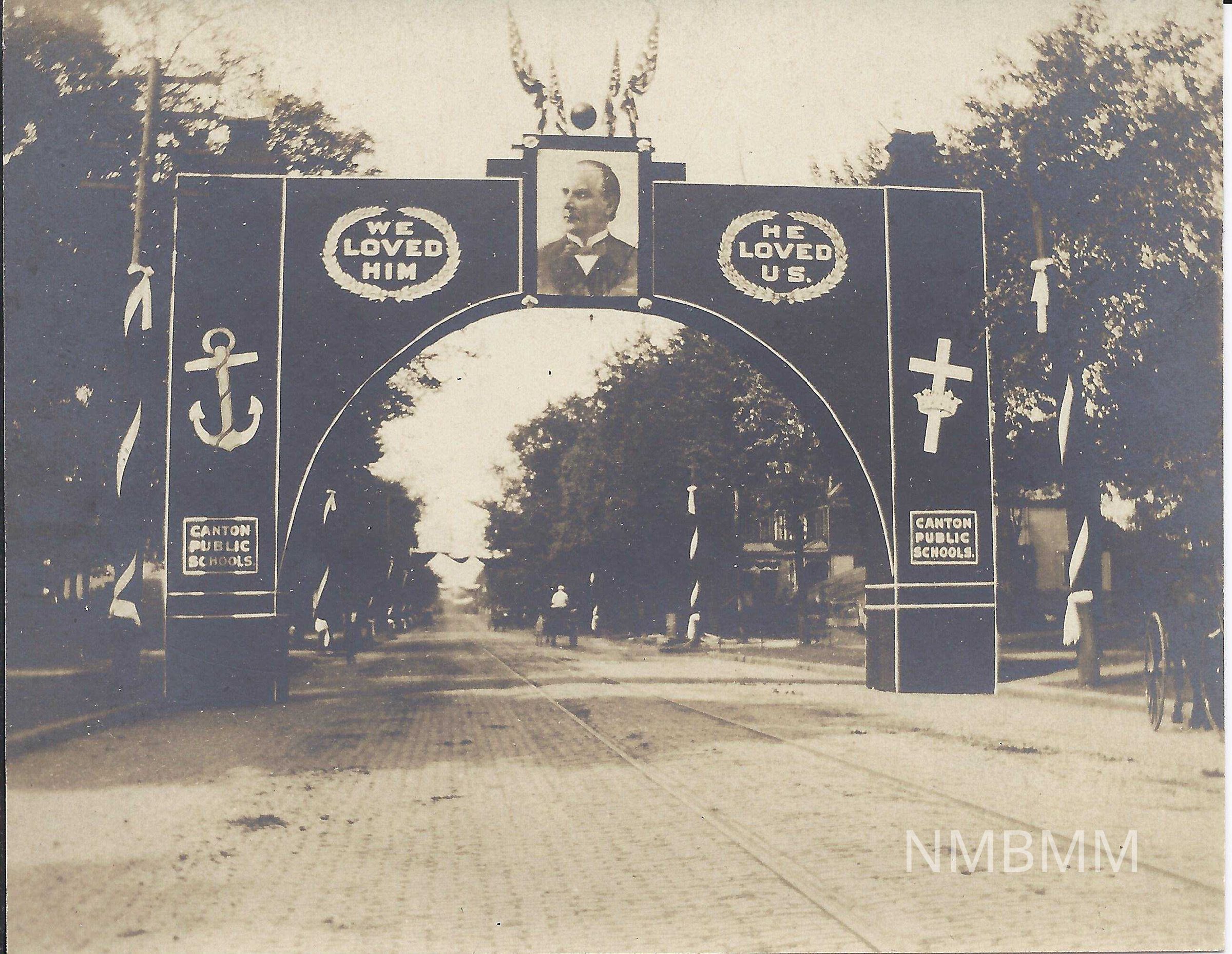 A copy of a photograph showing the front of the Canton Public School Arch made in honor of William McKinley.