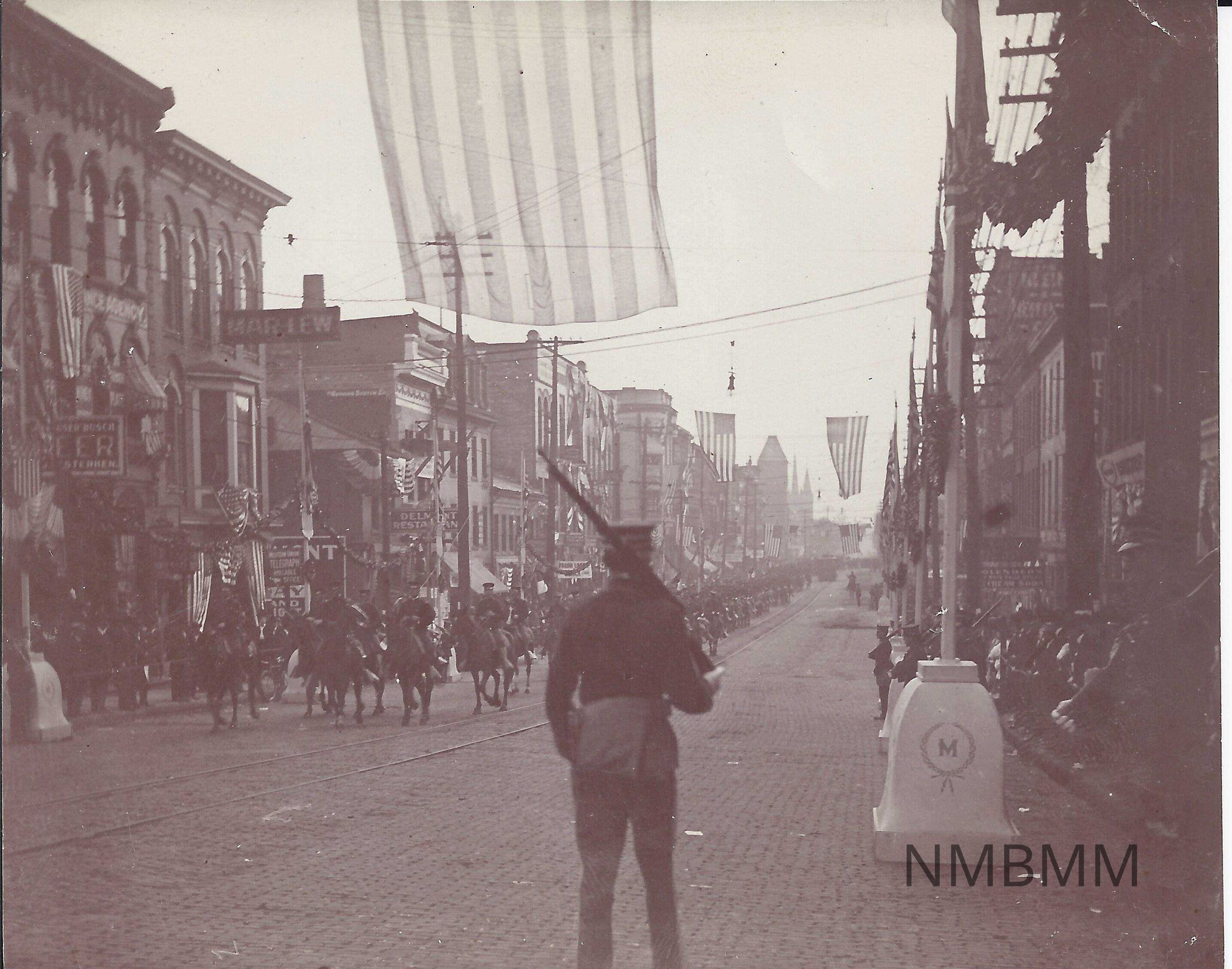 A photograph showing a soldier standing guard on a street in Canton, Ohio while a military parade of soldiers on horses rides through.