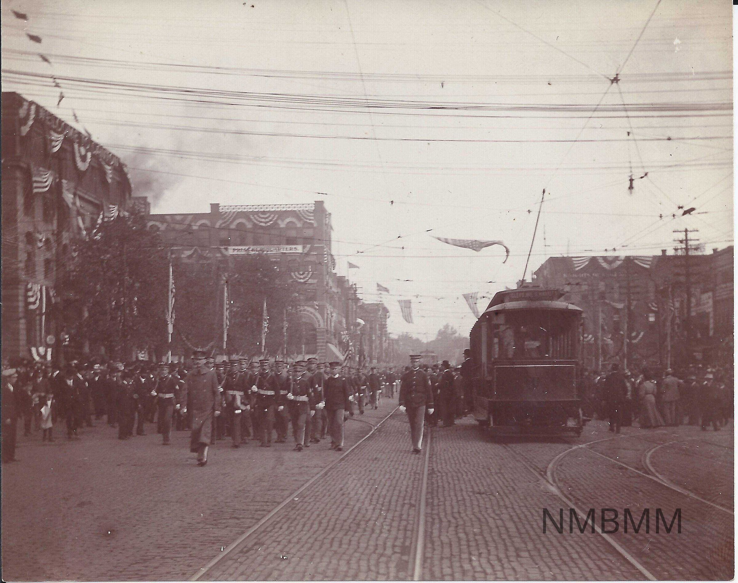 A photograph of soldiers marching through the streets of canton during William McKinley's funeral procession.Collection
