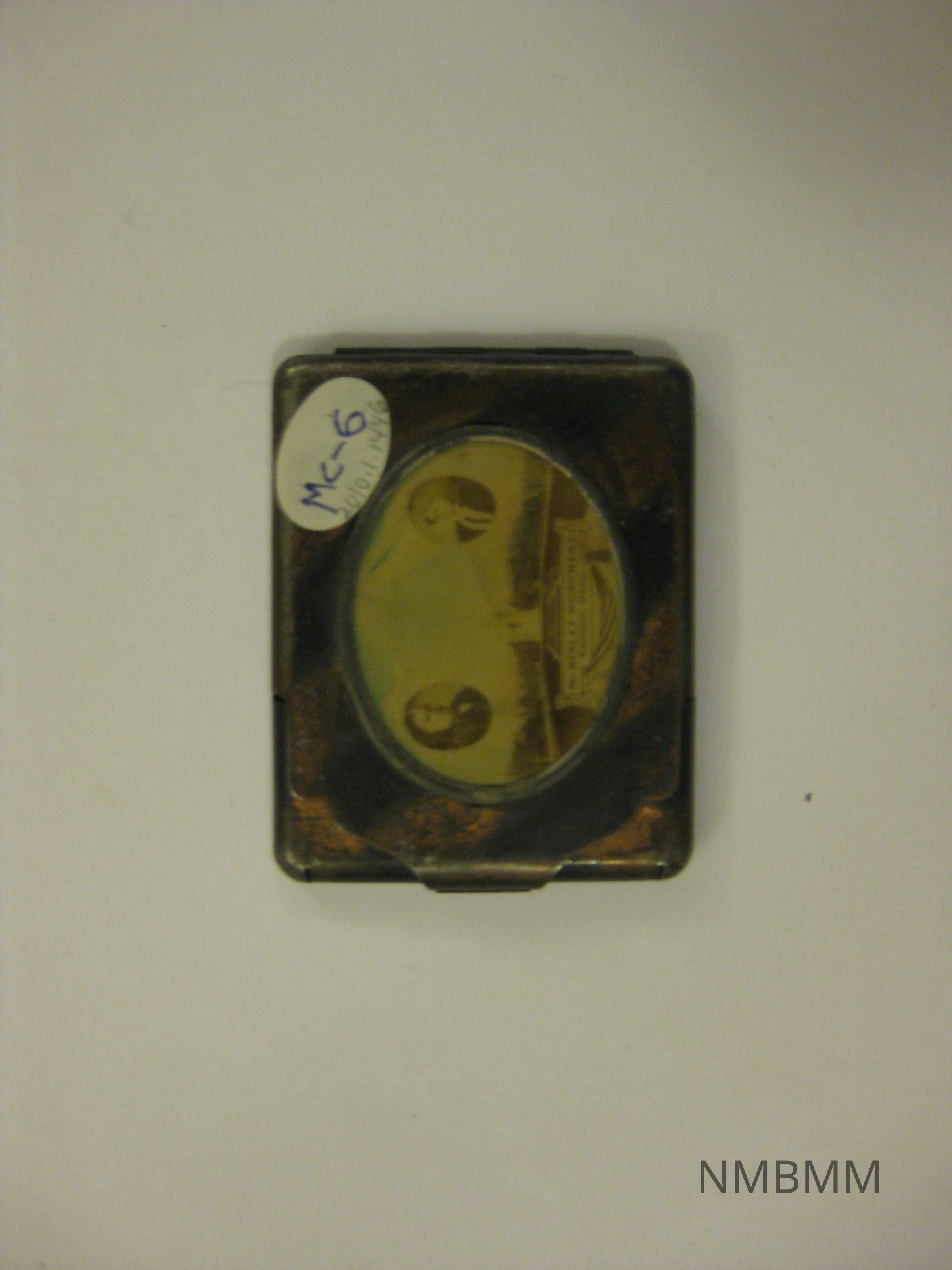 The item is a silver matchbox depicting the President McKinley Memorial in Canton, Ohio, with two portraits of President William and Ida McKinley.Collection